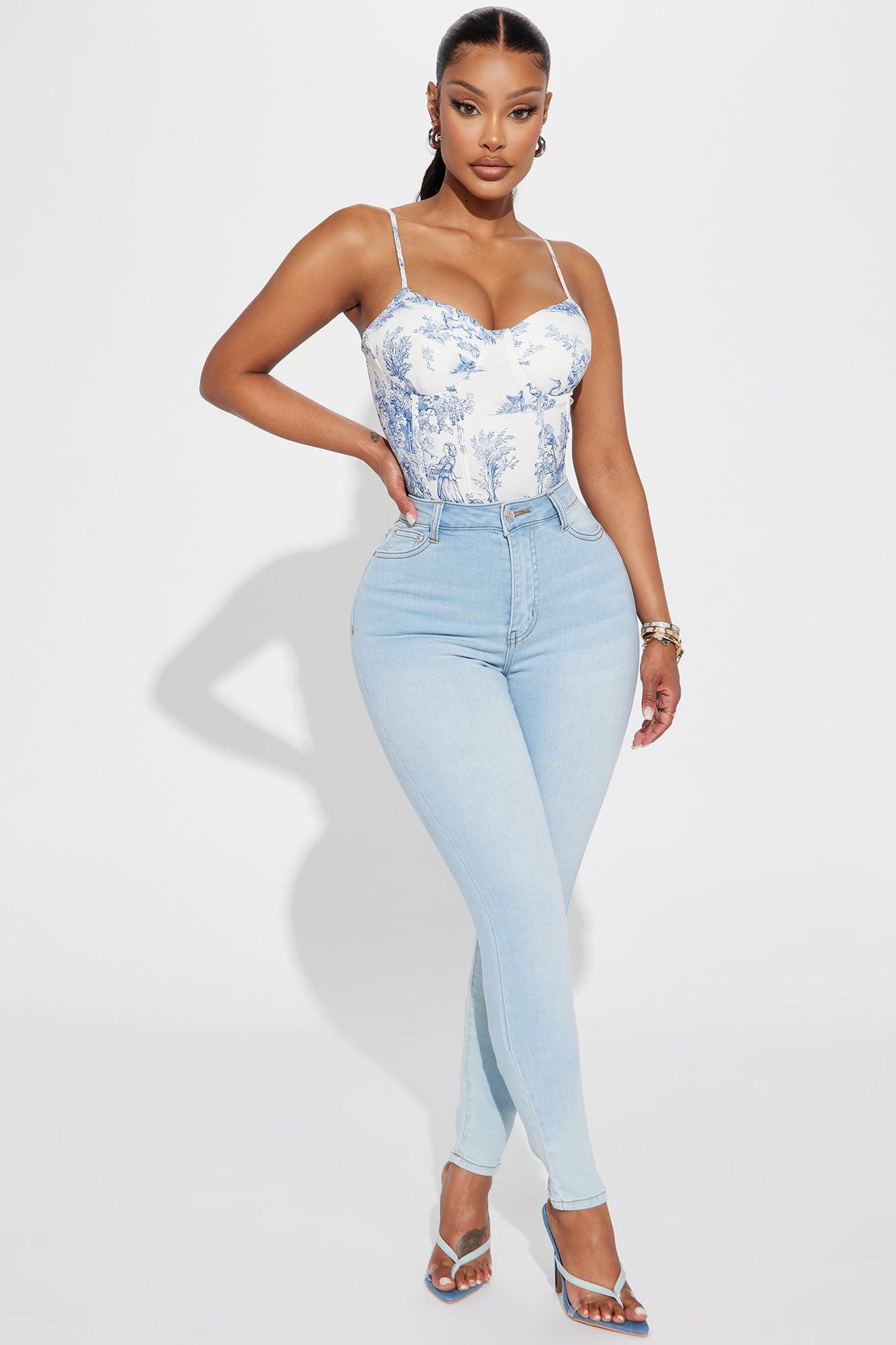 Owen Top - Puff Sleeve Tie Front Corset Detail Top in Toile De Jouy