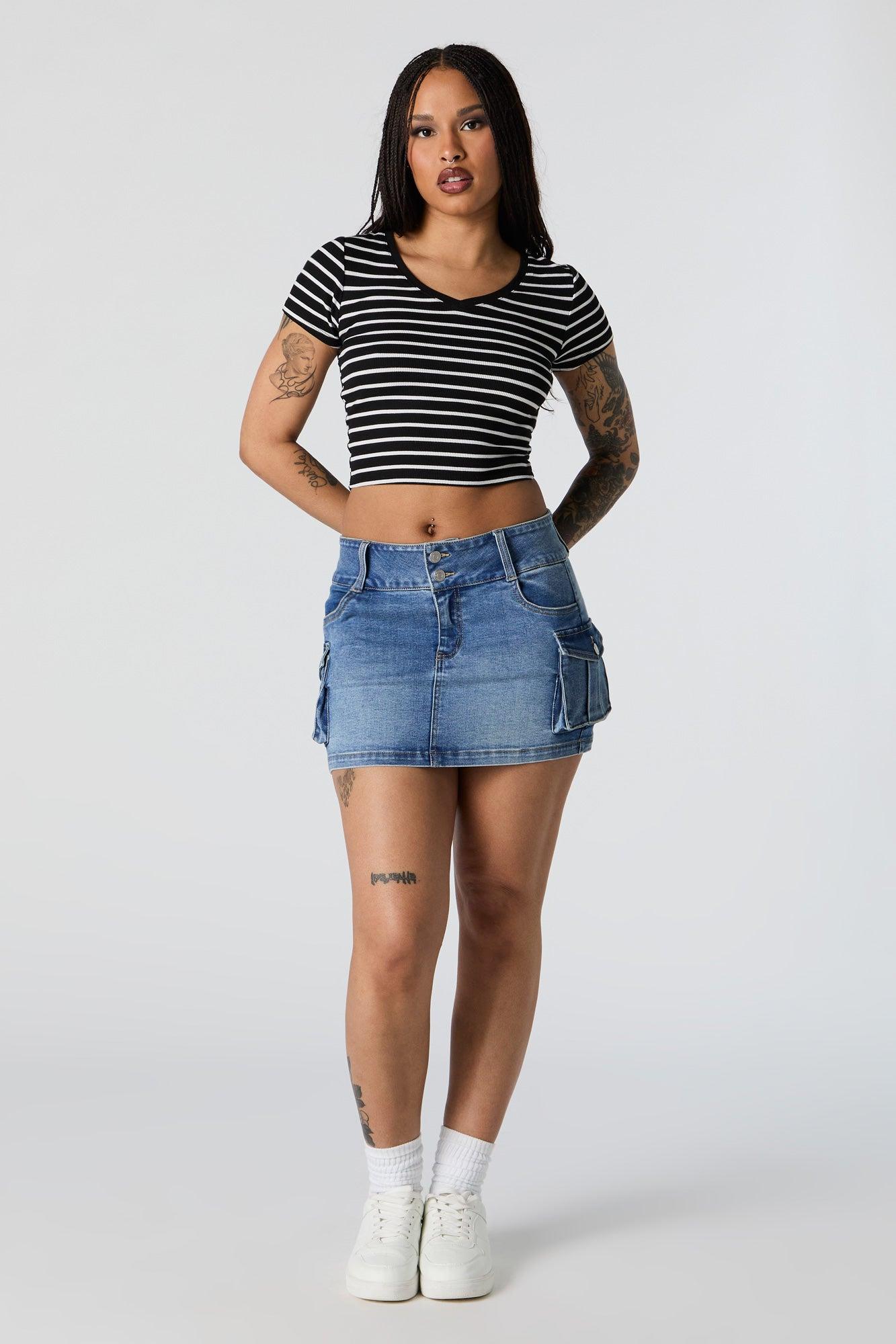 Wallace Mini Skirt - Mid Waisted Recycled Denim Utility Skirt in Mid Blue Wash