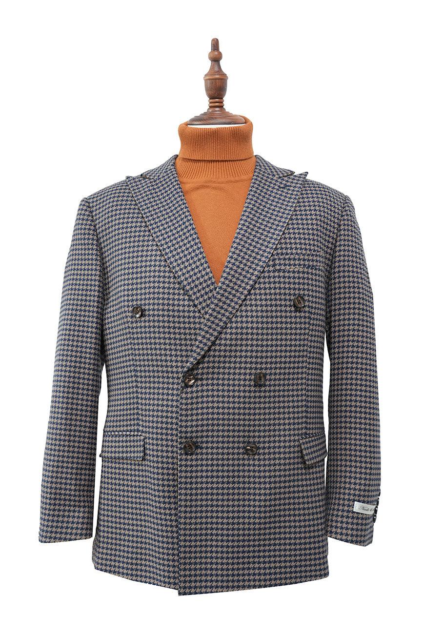 (2XL) Navy Houndstooth Slim Fit Double Breasted Jacket