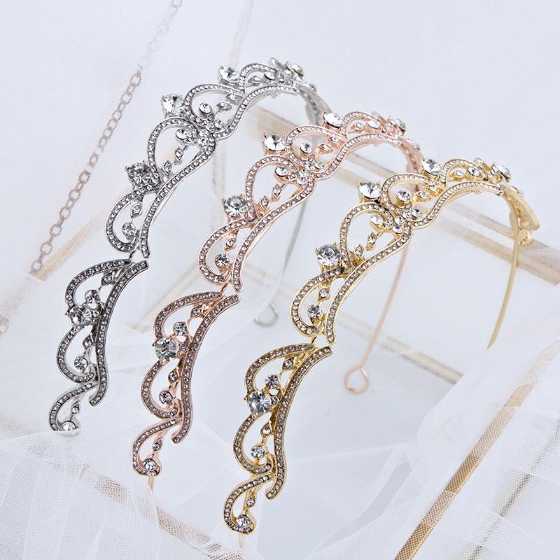Up your sparkle factor with this new tiara design that can complete the most sophisticated of bridal looks. Intricately faceted clear rhinestones work their way across the band in a swirly pattern and capture the light from every angle with a perfectly translucent appeal. Cast in lightweight alloy and rose gold/silver plated for a flawless finish, the headband measures 0.78" at the tallest point (approx. 2cm) and 6" in diameter (approx. 15cm). Two small loops at each end make it easy to attach to your hair with bobby pins.
