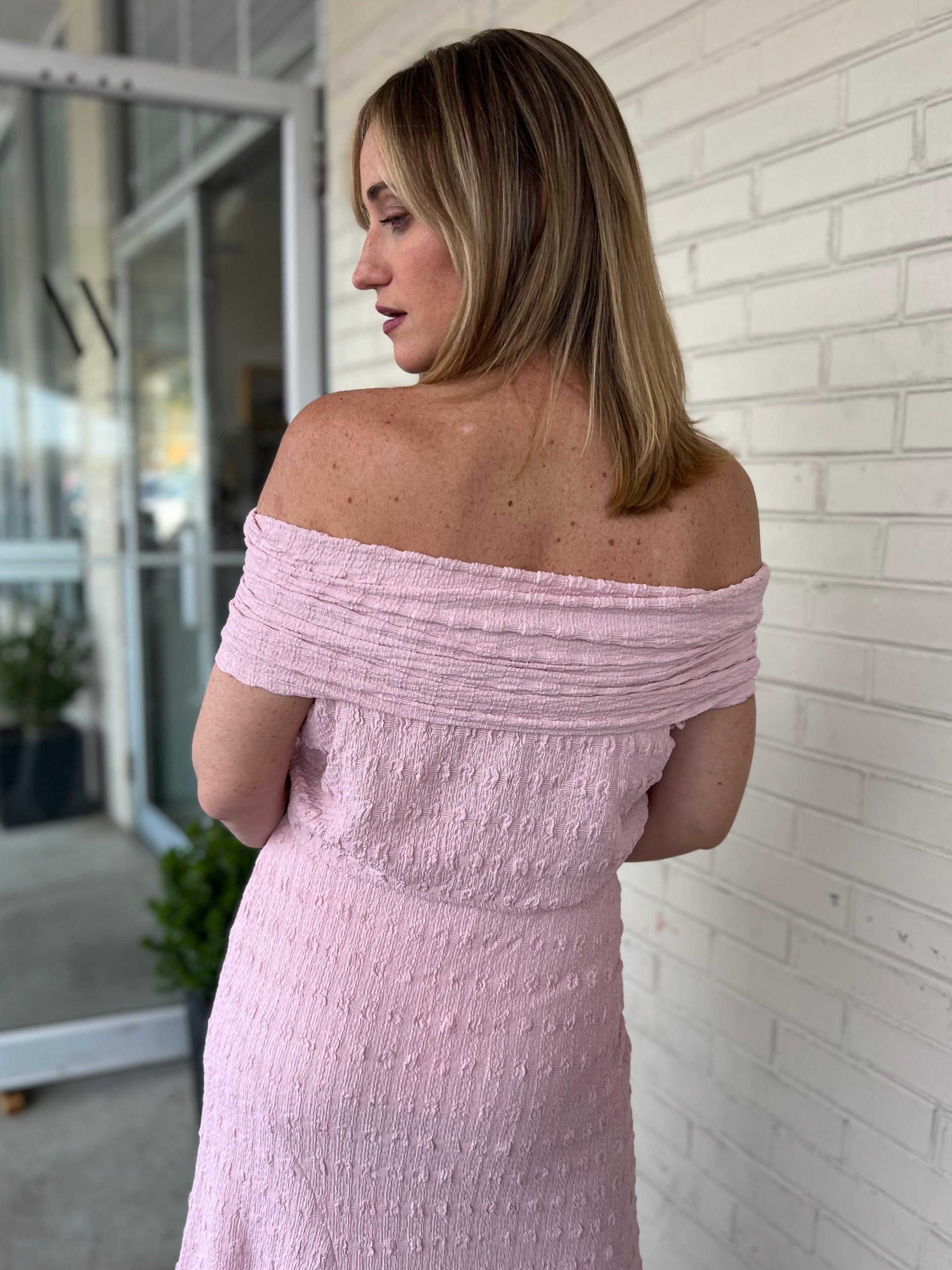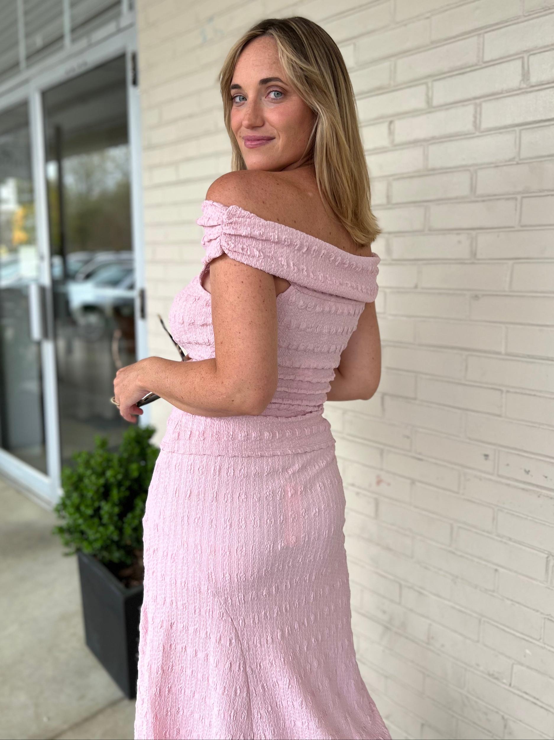 Add some fun and flair to your wardrobe with our Chelsea Knit Top! This textured pink top features off-shoulder details for a trendy touch. Want to make a statement? Pair it with our matching midi skirt for a cohesive and stylish look.