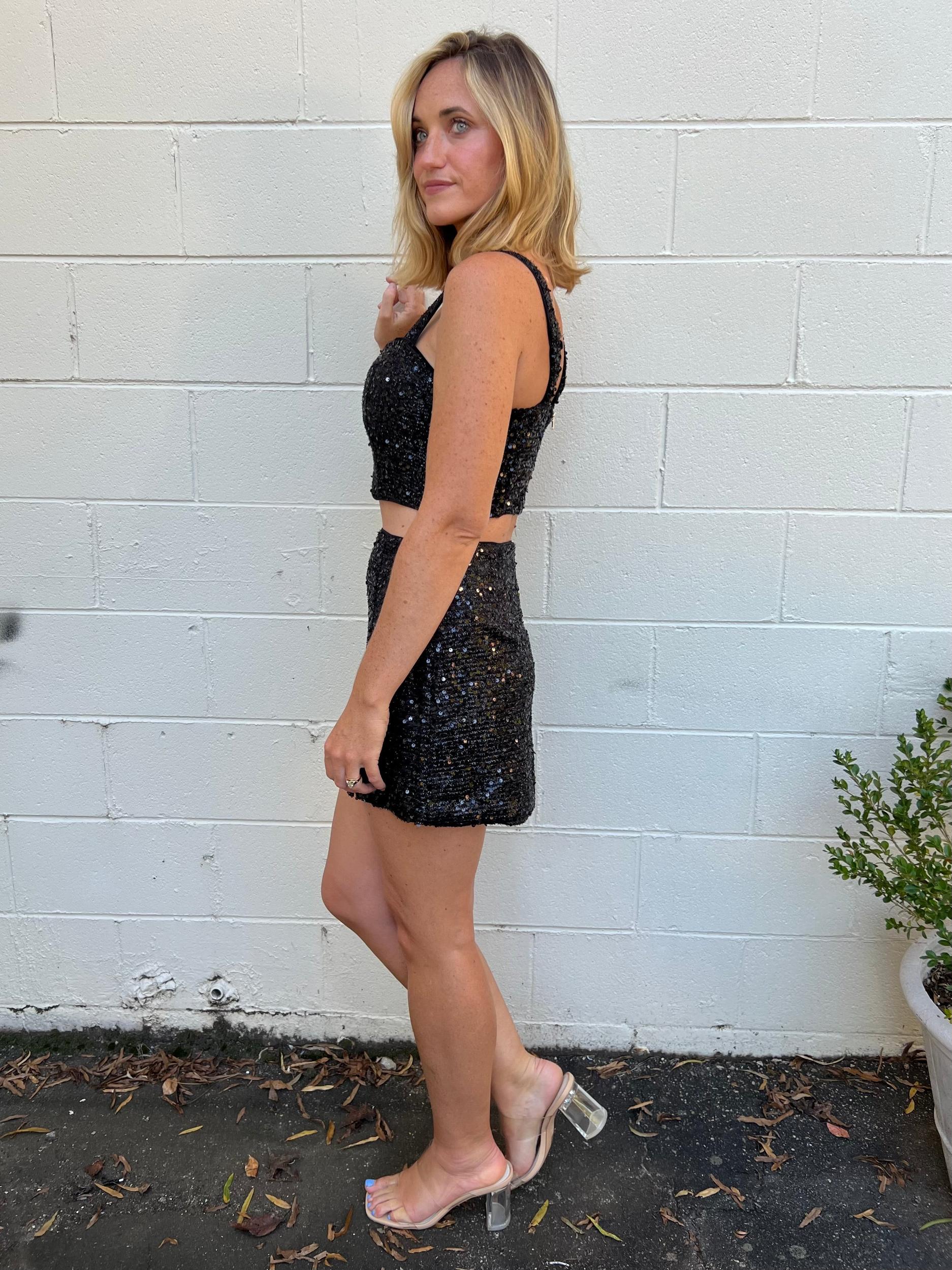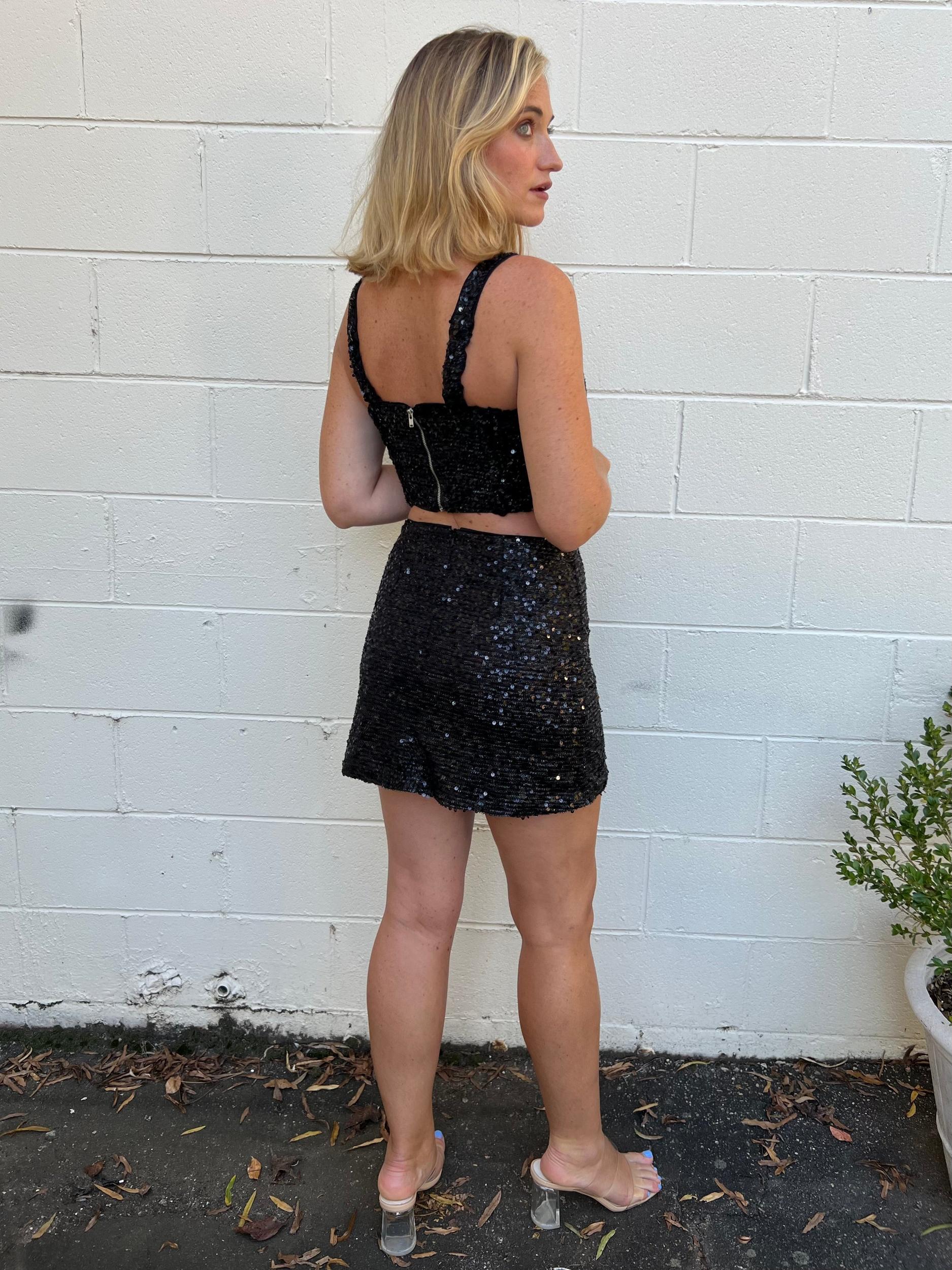 Stay chic and shimmering with the Sutton Mini Skirt! This black mini skirt features eye-catching sequin detail and a convenient zipper back closure. Pair it with the Sutton Crop Top for a trendy and stylish look.