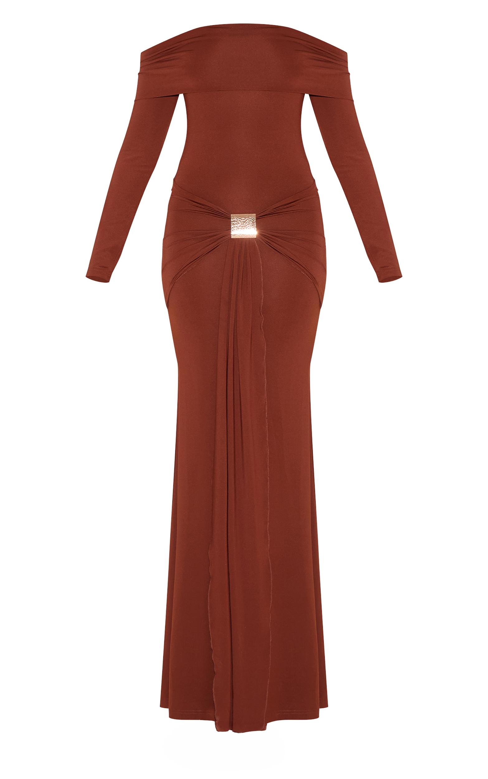 This chocolate bardot long sleeve trim drape detail maxi dress brings understated elegance to any wardrobe, cut to flatter with thoughtful gold trim detailing and a timeless silhouette with elegant draping. Perfect for any of your events this season, style this dress with chic pointed toe heels and simplistic gold earrings.Length approx 155cm/61inch (Based on sample size US 4)Model wears size UK 8/ EU 36/ AUS 8/ US 4Model Height - 5ft 9inchp]:!mb-4inch>Brand: PrettyLittleThingCategory: DressesProduct type: Shift DressColor: ChocolateMaterial: Slinky JerseyDesign: PlainNeckline: BardotSleeves: LongOccasion: Evening