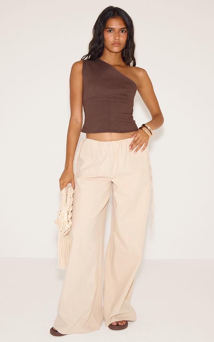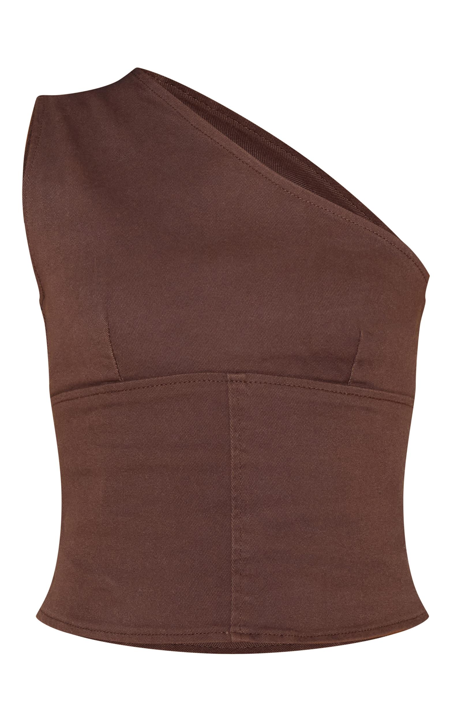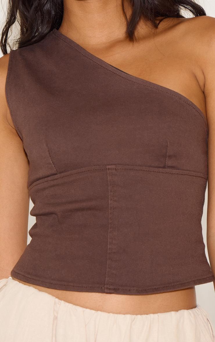 A modern take on classic denim, the chocolate brown asymmetric shoulder denim top introduces sculptural structure with a sultry twist. The rich cocoa hue feels elevated, while the one-shoulder design adds an architectural element that flatters the neckline. Finished with visible seam details for a touch of edge, this piece works perfectly with tailored pants or contrasted with a fluid satin skirt for high-low appeal. Length approx 48.5cm/19inch (Based on sample size US 4)Model wears size UK 8/ EU 36/ AUS 8/ US 4Model Height - 5ft 7inchp]:!mb-4inch>Brand: PrettyLittleThingCategory: DenimProduct type: Denim TopColor: Chocolate BrownMaterial: Stretch DenimDesign: PlainNeckline: One ShoulderSleeves: SleevelessOccasion: Day