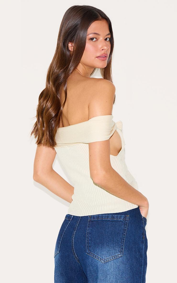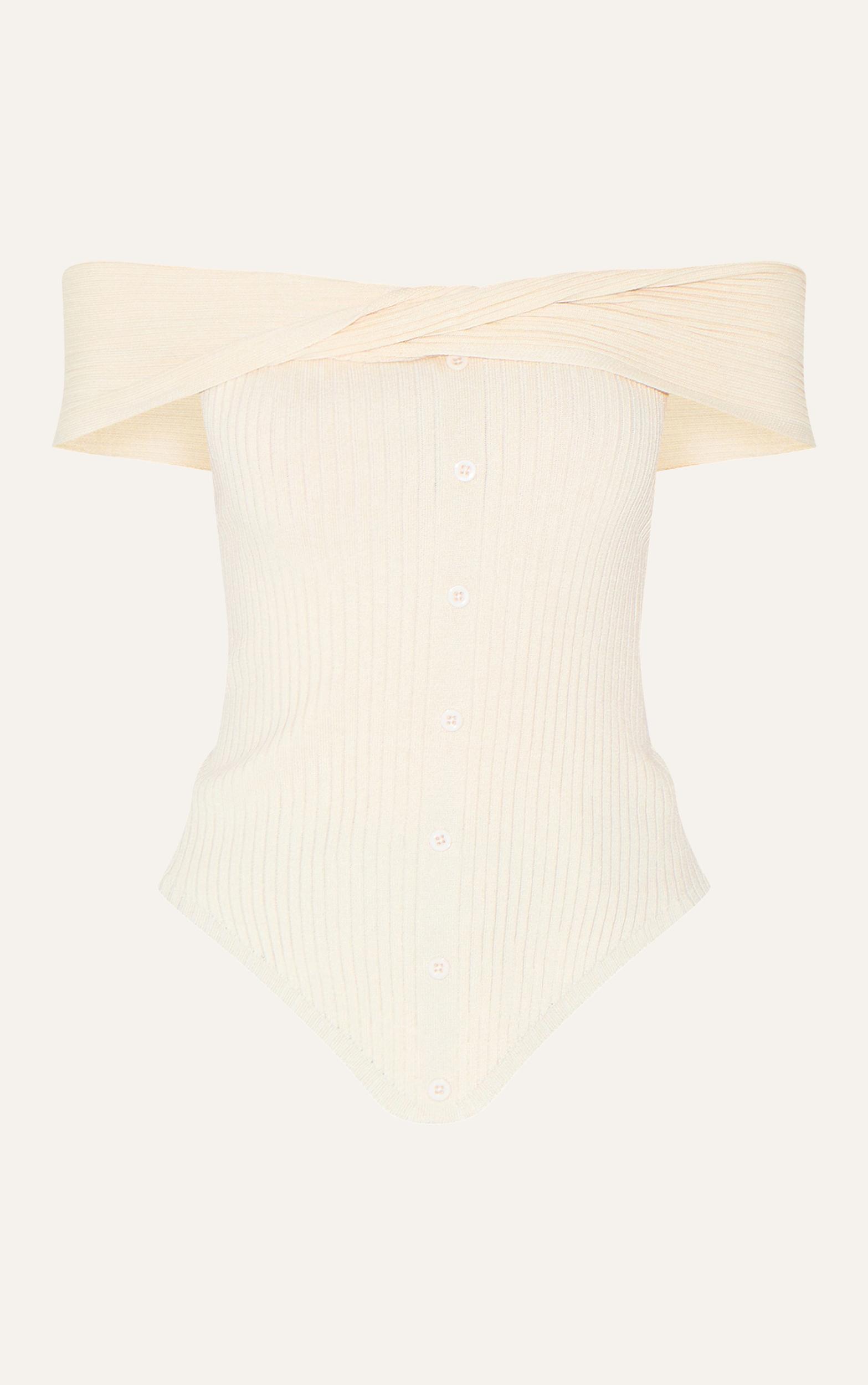 Say hello to your new season staple with this cream rib knit twist bardot button through top. Brought to you in a cream rib knit material with a twist bardot design, a button though detail and a long line fit. Style this bardot top with a pair of jeans and a pair of slingback court heels for a fool-proof finish.Length approx 48.5cm/19inch (Based on sample size S)Model wears size SModel Height - 5ft 7inchp]:!mb-4inch>Brand: PrettyLittleThingCategory: KnitwearProduct type: Bardot TopColor: CreamMaterial: KnitNeckline: BardotSleeves: SleevelessOccasion: Day