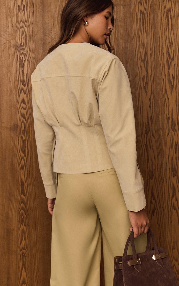 The ecru faux suede covered button cinch waist jacket blends softness with tailoring. The faux suede exterior feels plush, while the cinched waist is adjustable for a flattering fit. Covered buttons add tonal elegance. Layer it over any look for chic transitional styling.Length approx 48.5cm/19inch (Based on sample size US 4)Model wears size UK 8/ EU 36/ AUS 8/ US 4Model Height - 5ft 9inchp]:!mb-4inch>Brand: PrettyLittleThingCategory: OuterwearProduct type: JacketColor: EcruMaterial: Faux SuedeNeckline: RacerSleeves: LongOccasion: Day