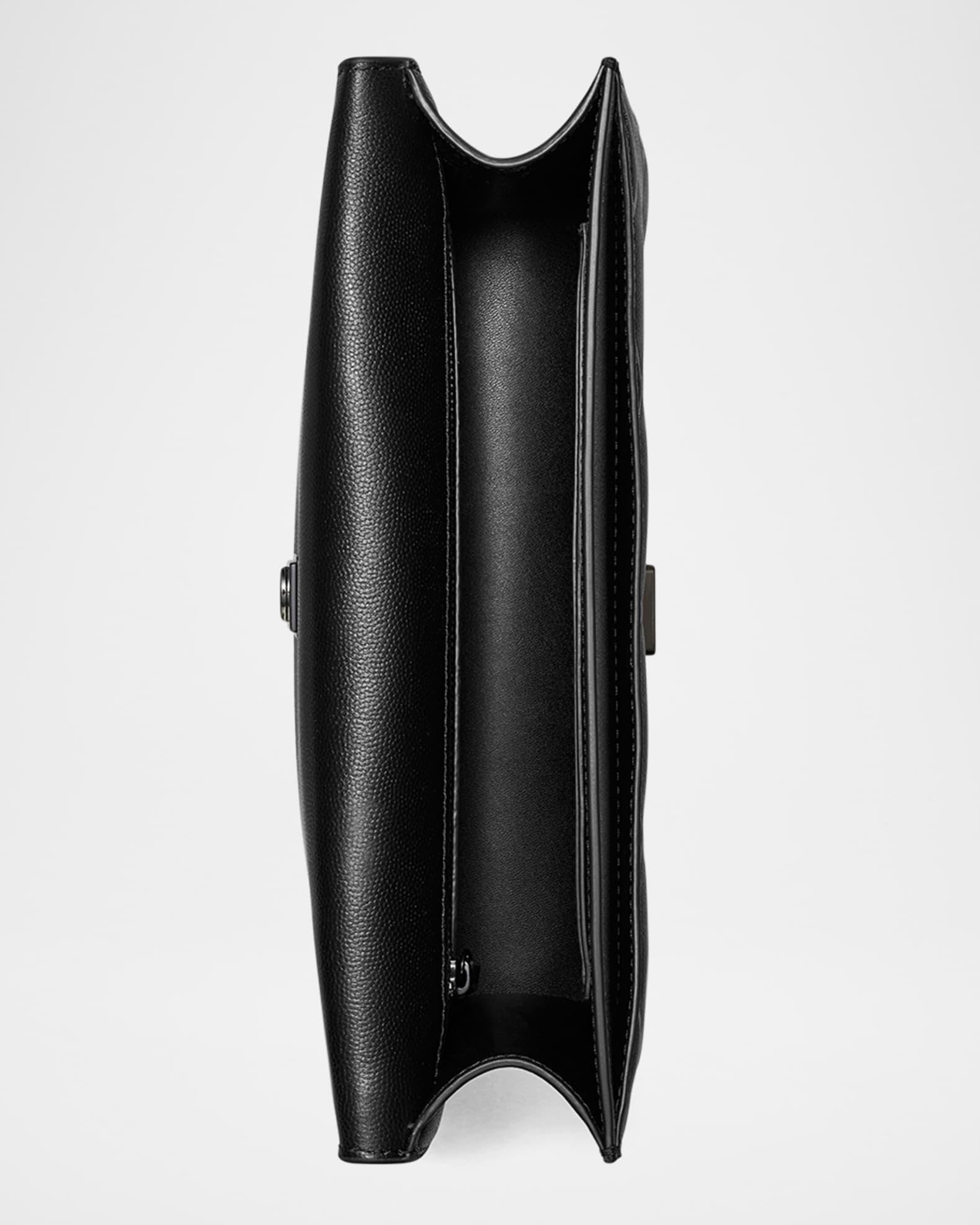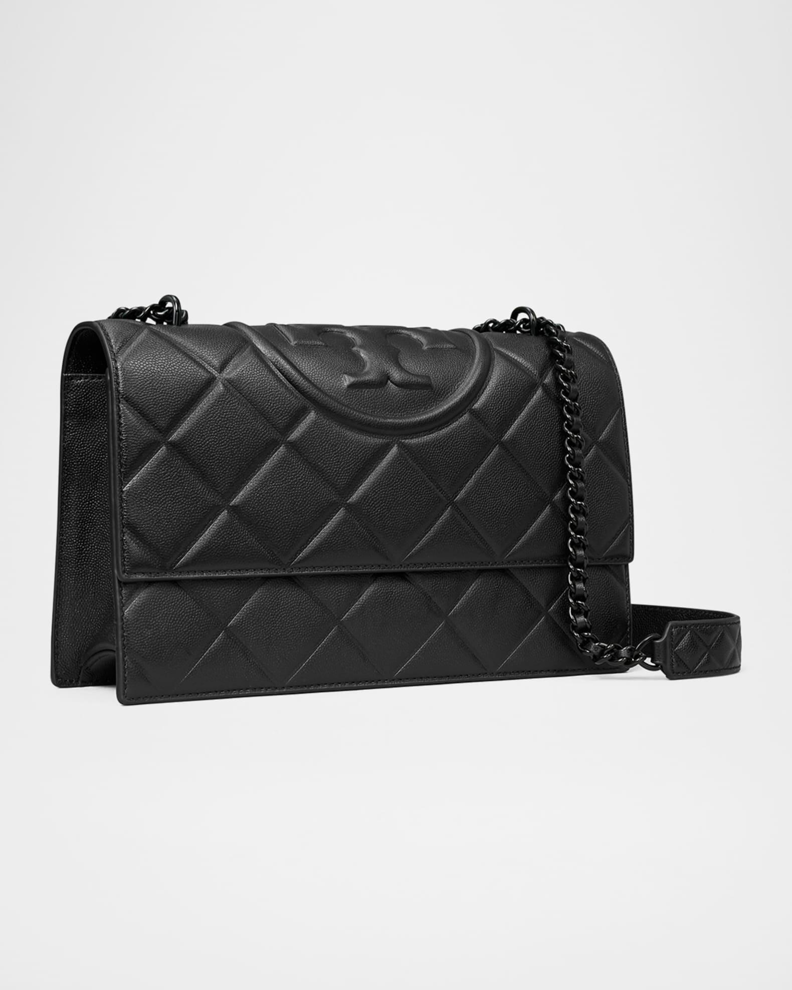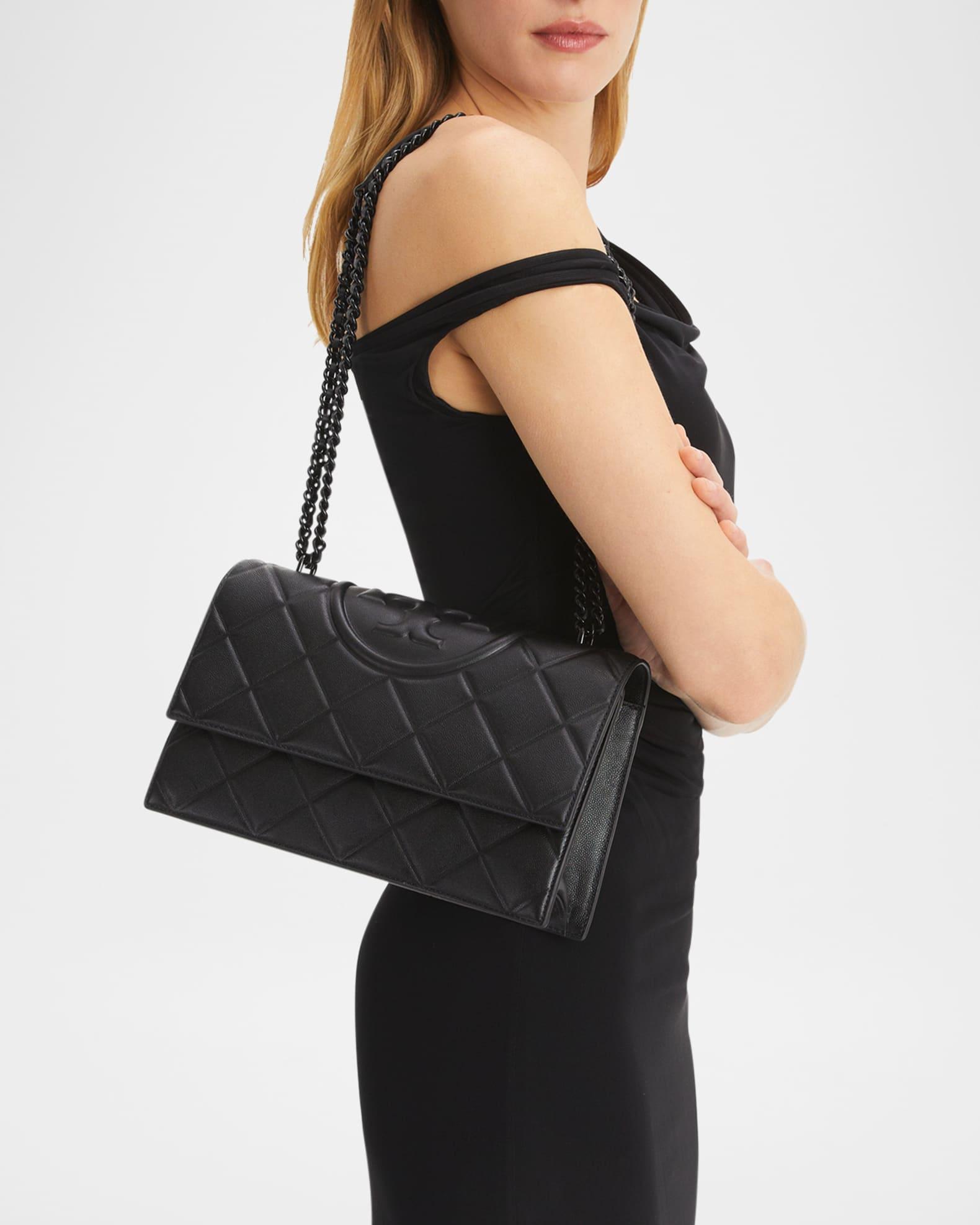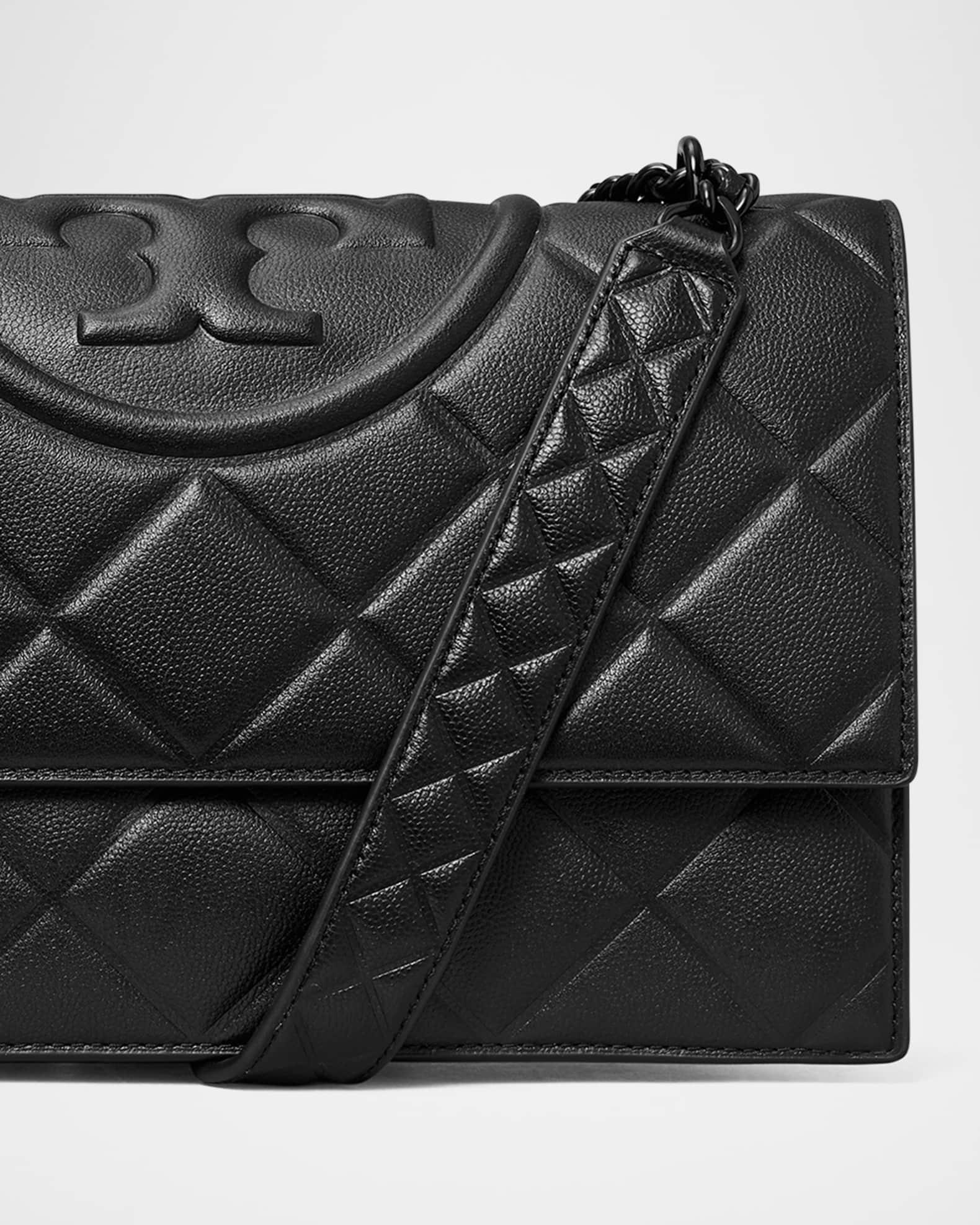 Tory Burch "Fleming" convertible shoulder bag in quilted soft grain leather and faux leather Tonal sliding chain/leather shoulder strap Flap top with snap closure Interior, one zip pocket and two slip pockets Lining: Polyurethane Approx. 7.1"H x 10.6"W x 3.3"D Polyurethane Imported