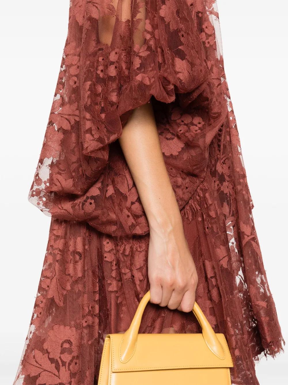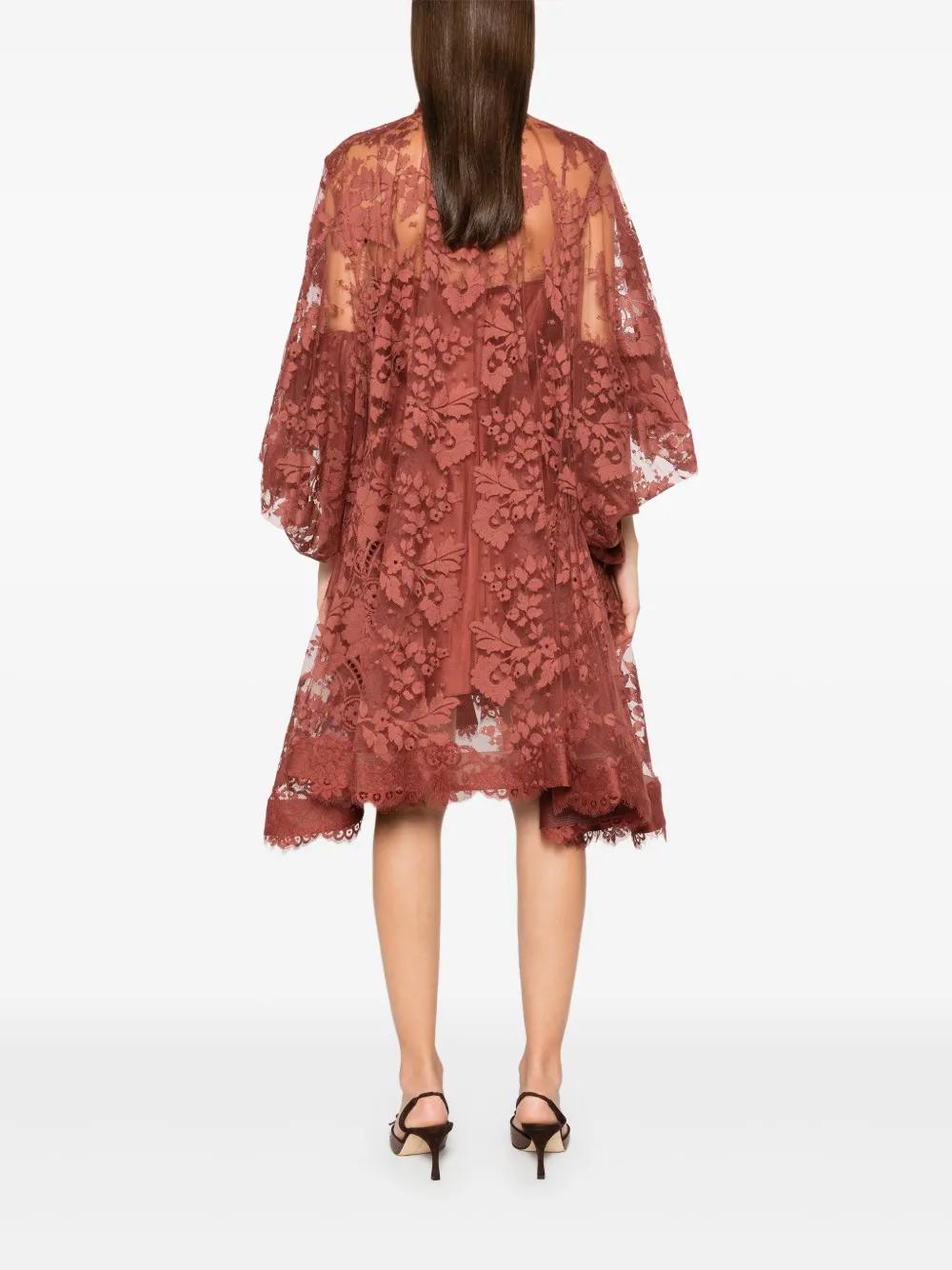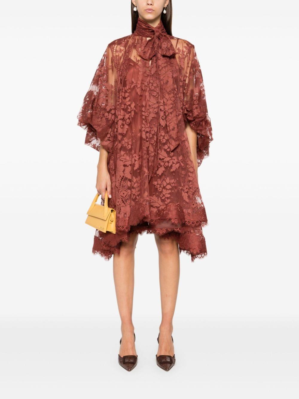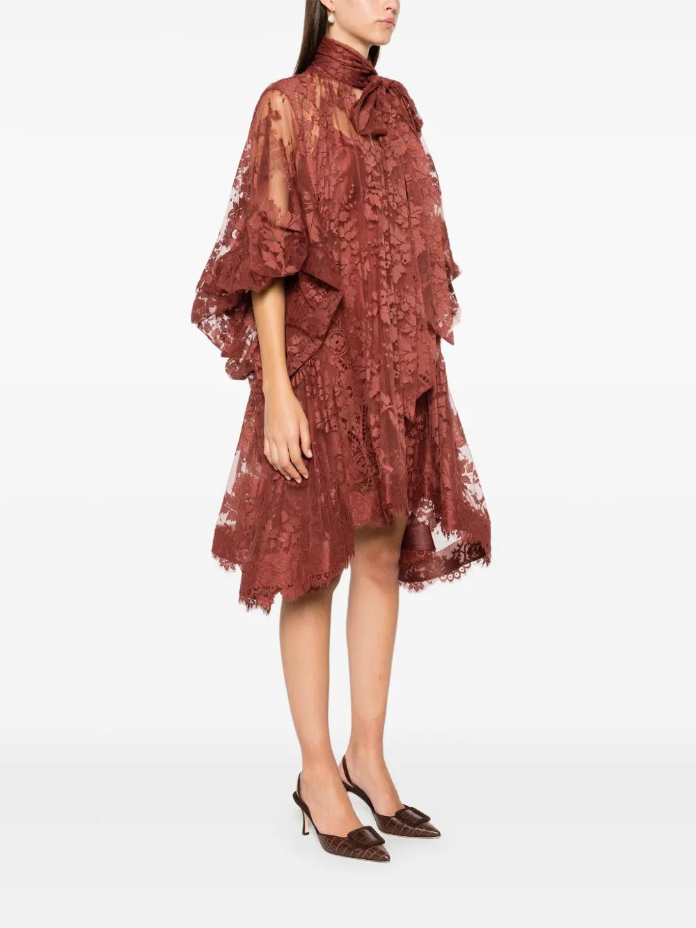 Shop Zimmermann Illustration Lace Mini Dress In Brown from 600+ stores, starting at $2587. Similar ones also available. On SALE now! Style Notes Swishing silhouettes are key to Zimmermann's AW24 collection, and the Illustration dress is cut to a billowing flared fit. Part of the runway show, this sheer floral lace style is decorated with ties at the neckline and framed with draped balloon sleeves. Info & Care Zimmermann lace dress Ties at V-neck, floral embroidered design, dropped shoulders, balloon batwing sleeves, elasticated cuffs,;handkerchief;hem, scalloped eyelash trim at hem, slip lining; Slips on; 63% cotton, 37% polyamide; lining: 100% silk; Dry clean; Size & Fit Length shoulder to hem: 1: 36 inches/ 91.5cm; 2: 40 inches/ 101.5cm Midweight; Loose fit; Model is 5'9"/ 175cm and wears a size;0