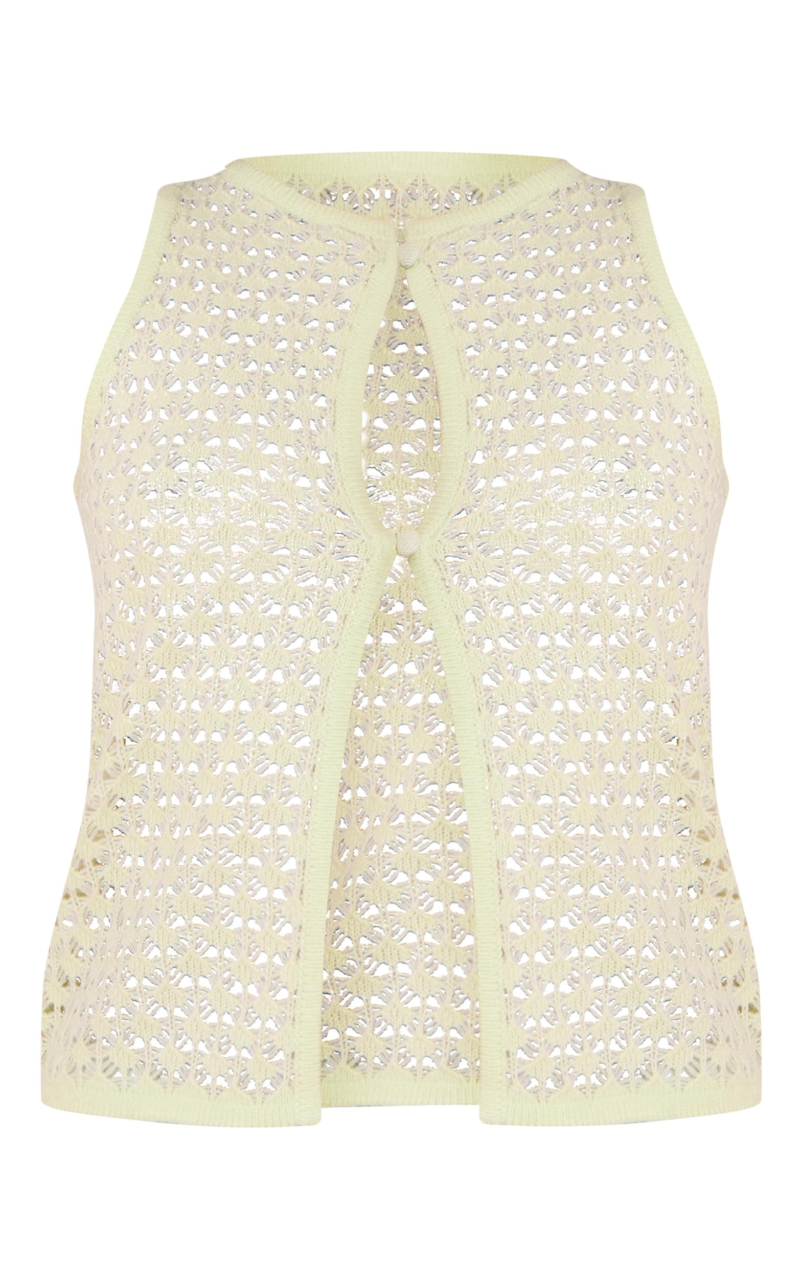Opt for pastel perfection in this lime crochet knit cut out pearled button vest top. Crafted from pale yellow knit material, this vest has delicate pearl buttons with a cut out design. Pair it with light wash jeans, sleek sandals and gold jewelry for a flawless finish.Length approx 48.5cm/19inch (Based on sample size US 4)Model wears size UK 8/ EU 36/ AUS 8/ US 4Model Height - 5ft 7inchp]:!mb-4inch>Brand: PrettyLittleThingCategory: KnitwearProduct type: WaistcoatColor: LimeMaterial: KnitOccasion: Day