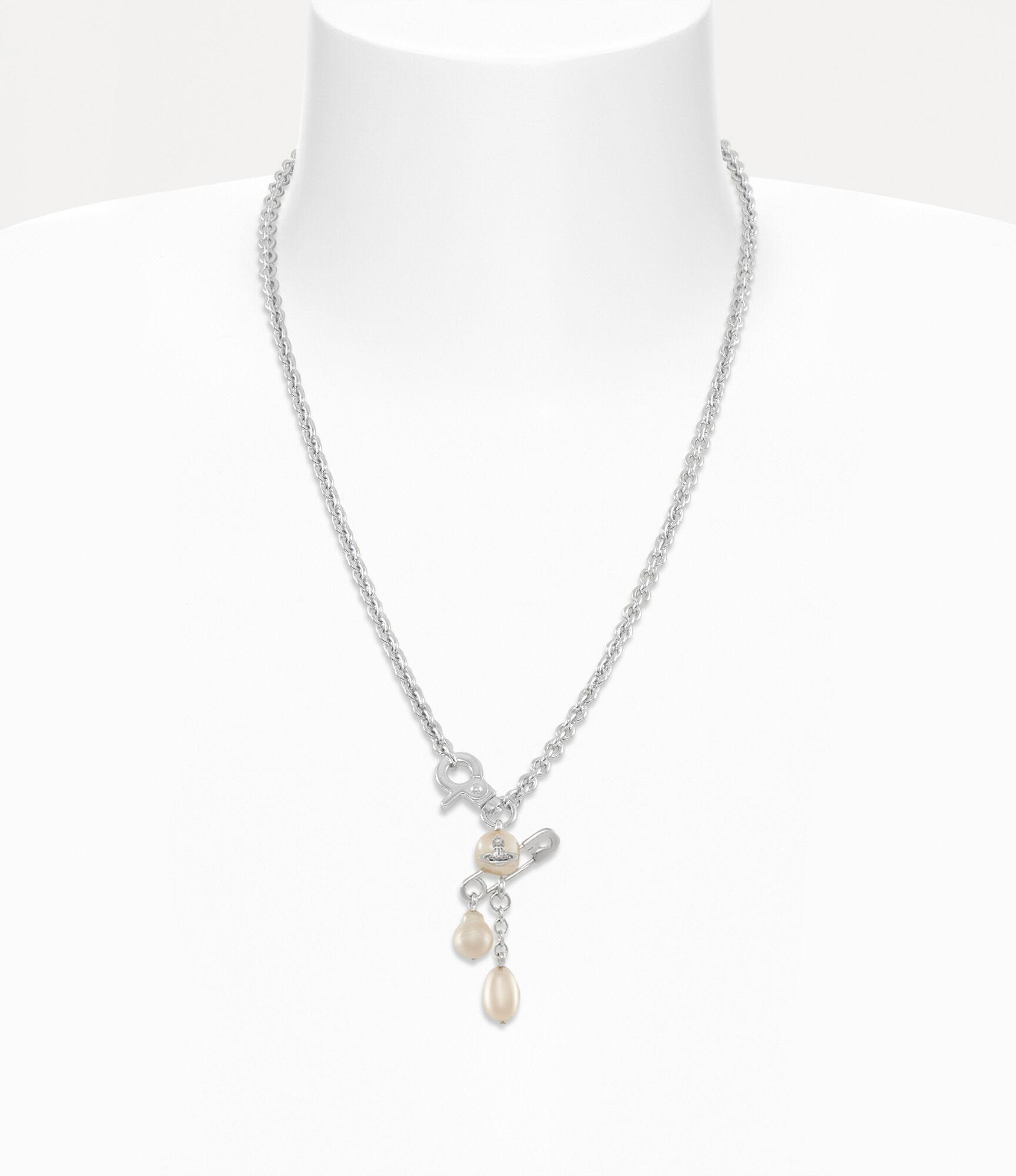 The Man. Claude Small Pendant necklace features a rounded pearl with a central orb, accented by a signature safety pin detail - a nod to Vivienne's punk-inspired, non-conformist style. A pearl drop and chain detail hang elegantly from the pendant, adding movement to the design, while the hardware-inspired clasp allows for an easy closure.