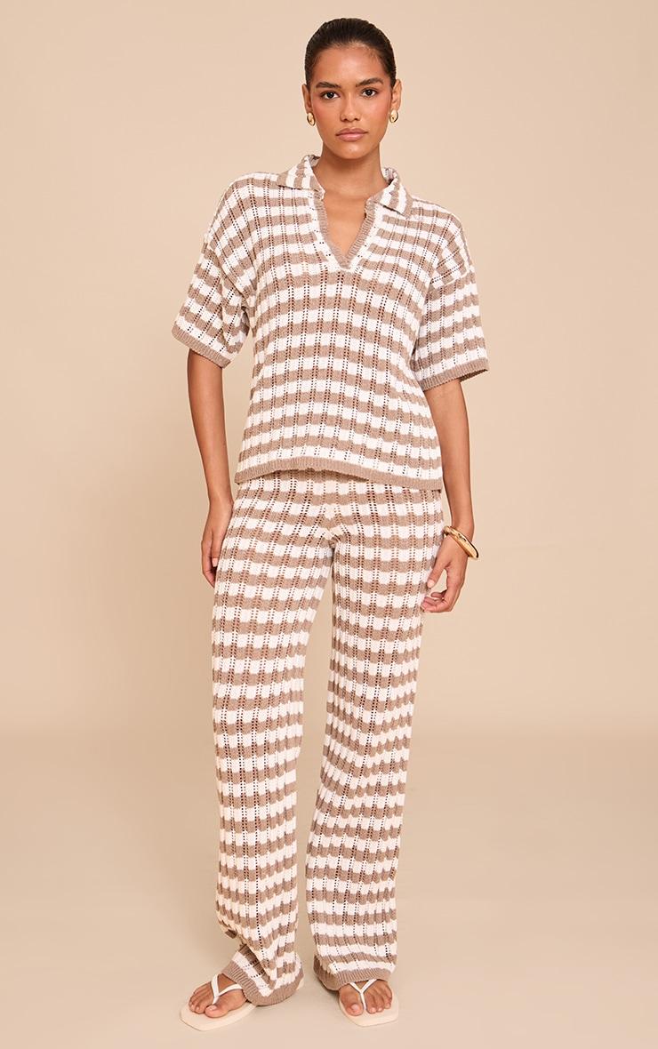 Elevate your outfit of the day with this mocha crochet stripe rugby knit top. Brought to you in a mocha crochet knit material with a stripe design and a flattering plunging neckline. Team with the matching pants and gold accessories for a fool proof finish. Length may vary due to crochet knitModel wears size SModel Height - 5ft 7inchp]:!mb-4inch>Brand: PrettyLittleThingCategory: KnitwearProduct type: TopColor: MochaMaterial: KnitDesign: PlainNeckline: ShirtSleeves: LongOccasion: Day