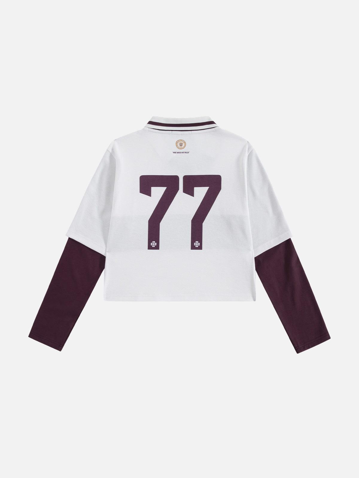 Designed with a sharp V-neck and cropped silhouette, this jersey blends classic collegiate graphics with a modern street cut. The layered long-sleeve look adds visual depth, while bold lettering and the “77” detail bring a confident, statement-ready feel. Clean lines, balanced proportions, and an easy boxy fit make it a standout piece that works on its own or as part of a layered street setup. Material: 100% Cotton. Clothing details: 77 Graphic. SIZE GUIDE
