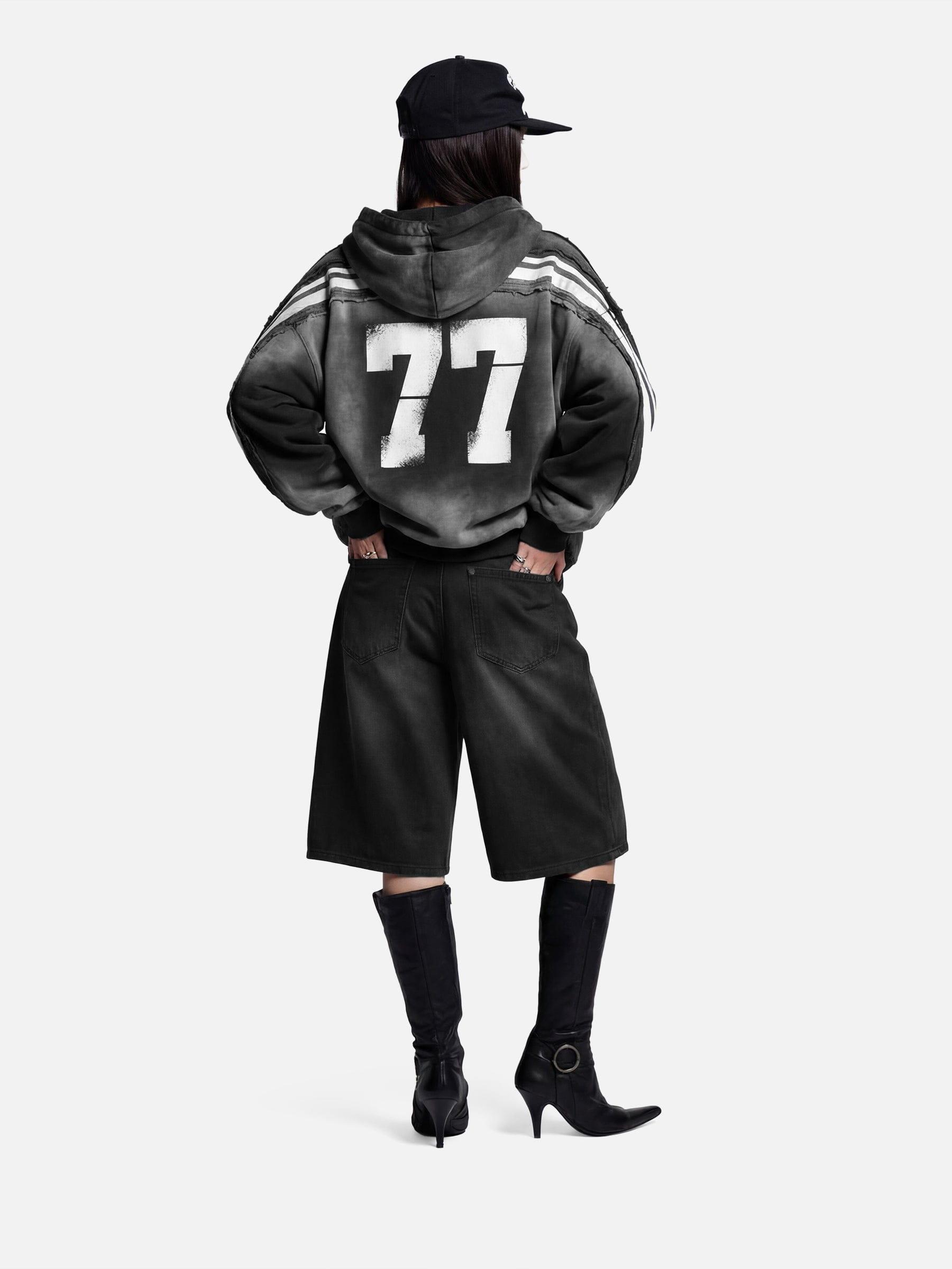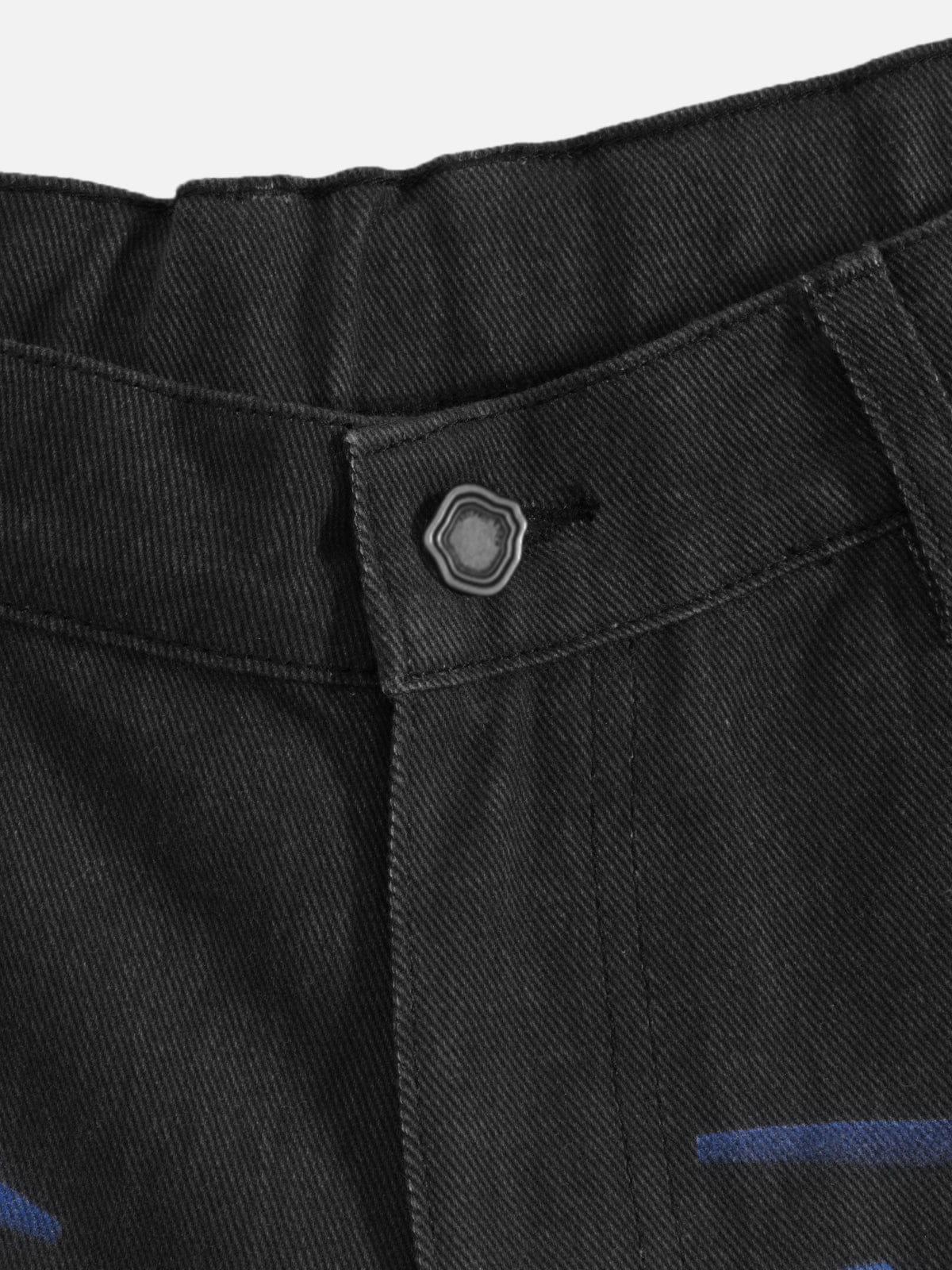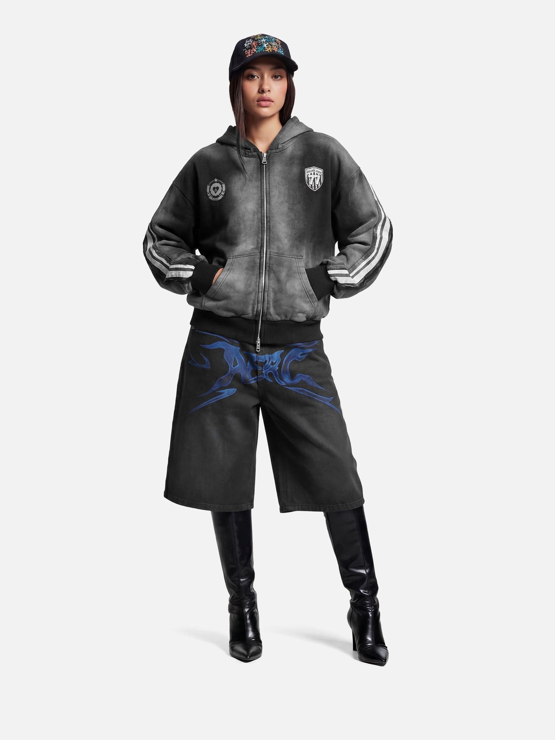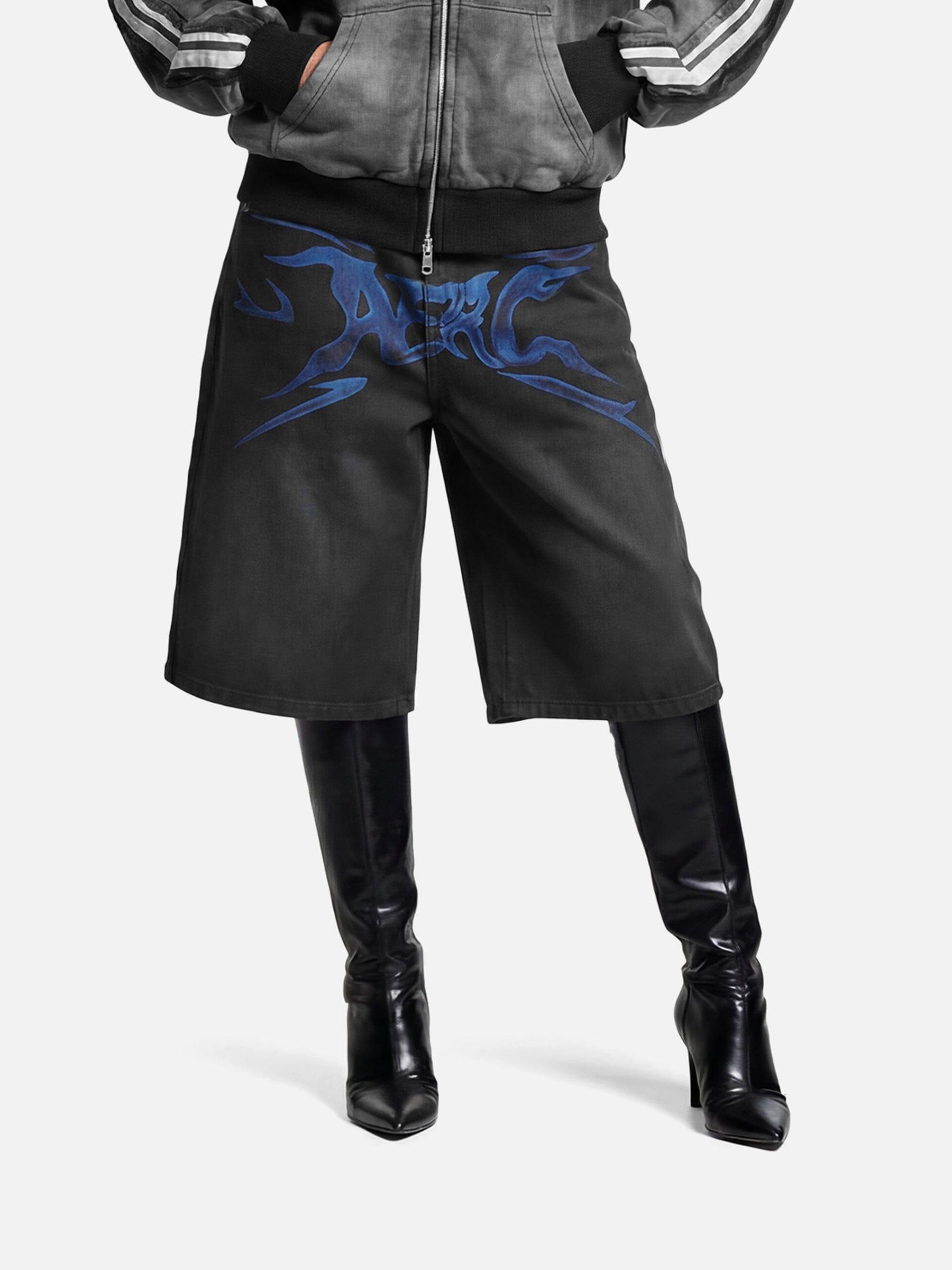 Designed with a bold flame graphic across the front, these jorts bring sharp visual energy to a clean, relaxed silhouette. The washed black denim gives a worn-in texture, balancing the aggressive graphic with an effortless feel. Cut in a wide, knee-length shape, they’re easy to style and built for everyday wear—graphic-led, street-driven, and unapologetically bold. Material: 100% Cotton. Clothing details: Flame Graphic. SIZE GUIDE