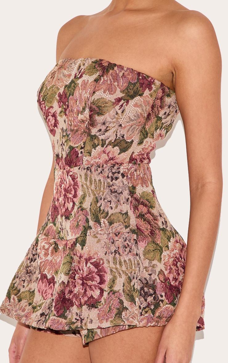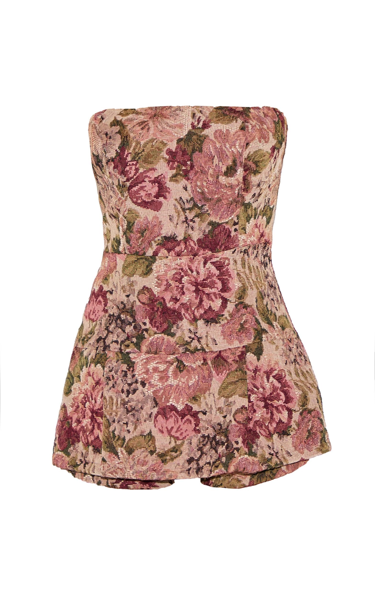 The bandeau silhouette gets a modern update in this stone floral jacquard romper. Crafted from a tactile jacquard with a subtle floral motif, the pleated skort detail adds a contemporary edge to this all-in-one piece. The bandeau neckline allows for versatile styling – wear it solo for a minimalist statement, or layer with a fine knit cardigan for cooler evenings. Finish the look with delicate gold jewelry from our collection for a refined take on after-dark dressing. Length approx 81cm/32inch (Based on a sample size UK 8) Model wears size UK 8/ EU 36/ AUS 8/ US 4Model Height - 5ft 9inchp]:!mb-4inch>Brand: PrettyLittleThingCategory: DressesProduct type: Skort PlaysuitColor: StoneMaterial: TwillOccasion: Evening