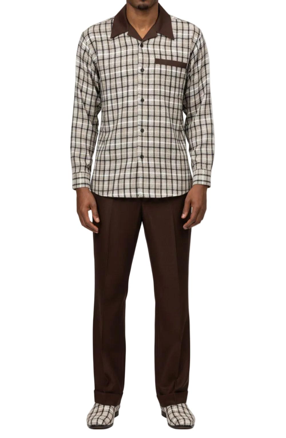 (XL/38) Brown Mini Plaid Pattern Long Sleeve Walking Suit