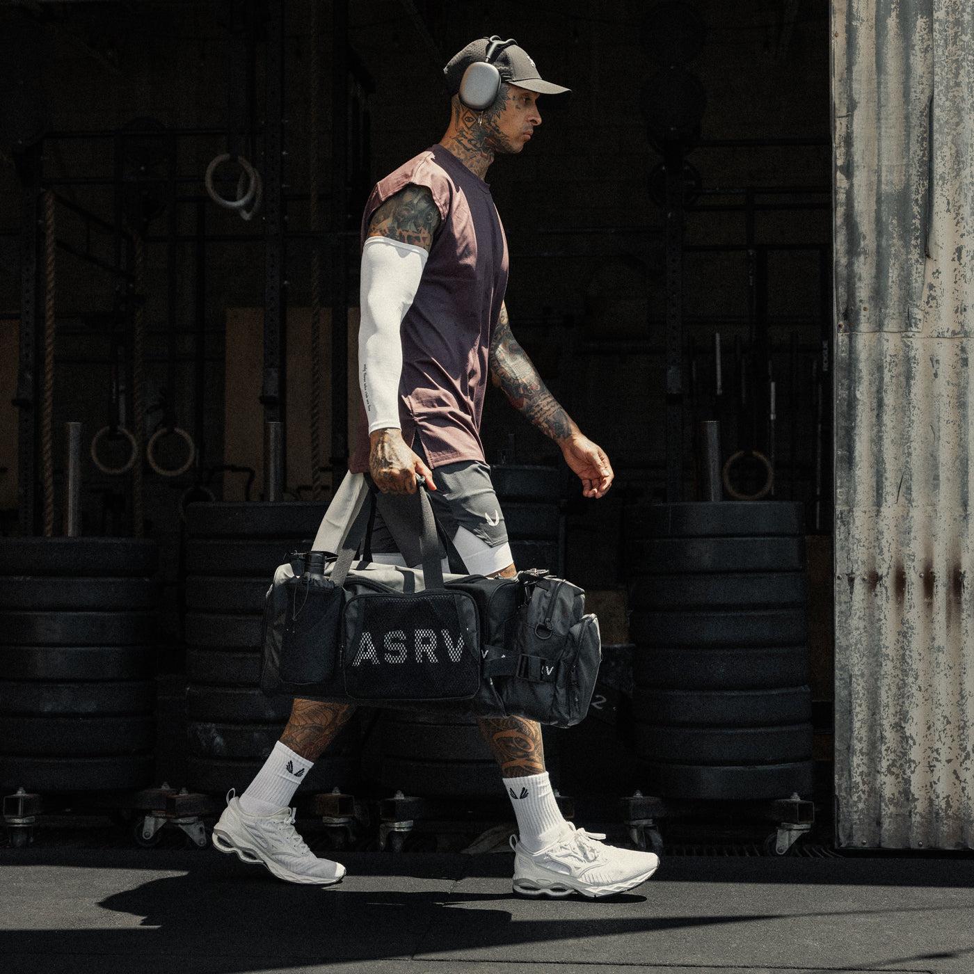 Large duffle bag designed for travel with waterproof fabrication, sectioned storage, and ultra durable trims. Detachable shoulder bag uses soft-touch velcro and Fidlock® magnetic buckle for easy removal. External zip pockets, padded iPad slot, neoprene water bottle slot, and thick webbing strap offer additional storage. Left side features shoe compartment with anti-odor strip. Shoulder strap easily transfers from duffle to shoulder bag. Complete with custom grenade zipper pulls.