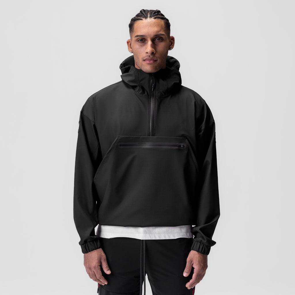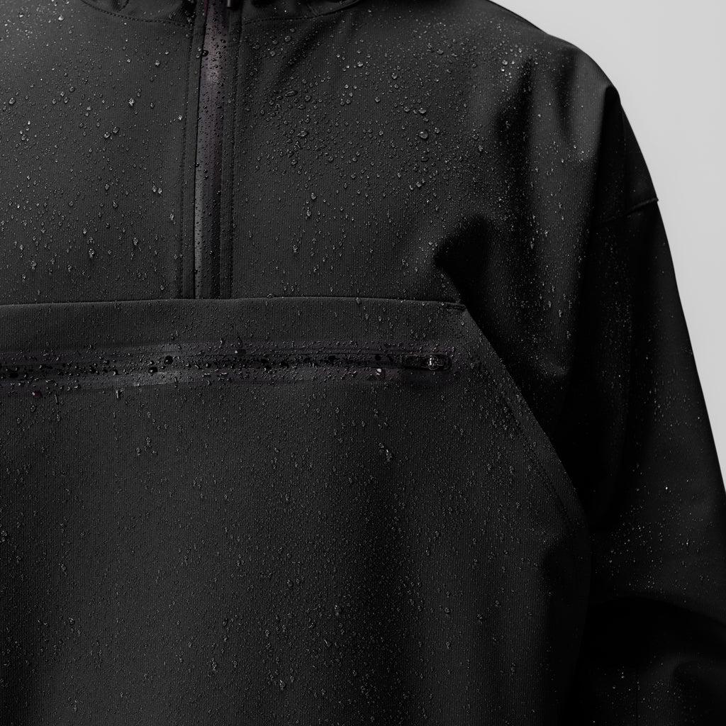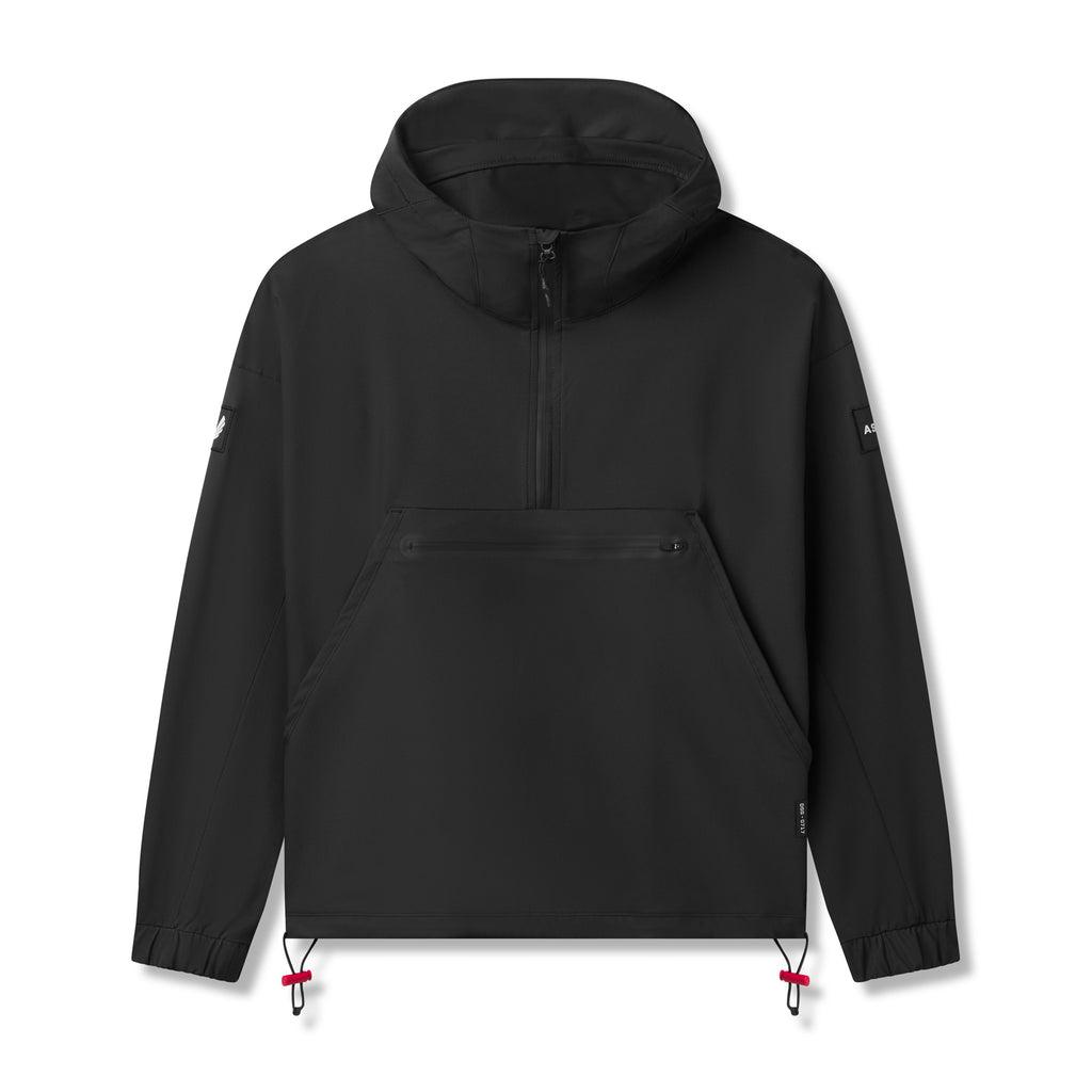 Anorak style jacket constructed from a water-resistant stretch material for transitional climates. Reflective horizontal drop pocket provides secure storage. Bottom hem features double-sided red cord locks for an adjustable fit. Hood cinch creates a secure fit for unobstructed vision. Channeled elastic sleeve cuffs. Finished with inlaid patch logos on both arms. Model is 5'11 170lbs and usually wears size M. This product fits true to size so he is wearing size M for a standard fit.