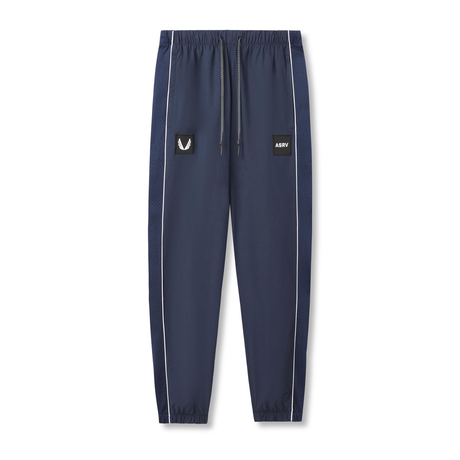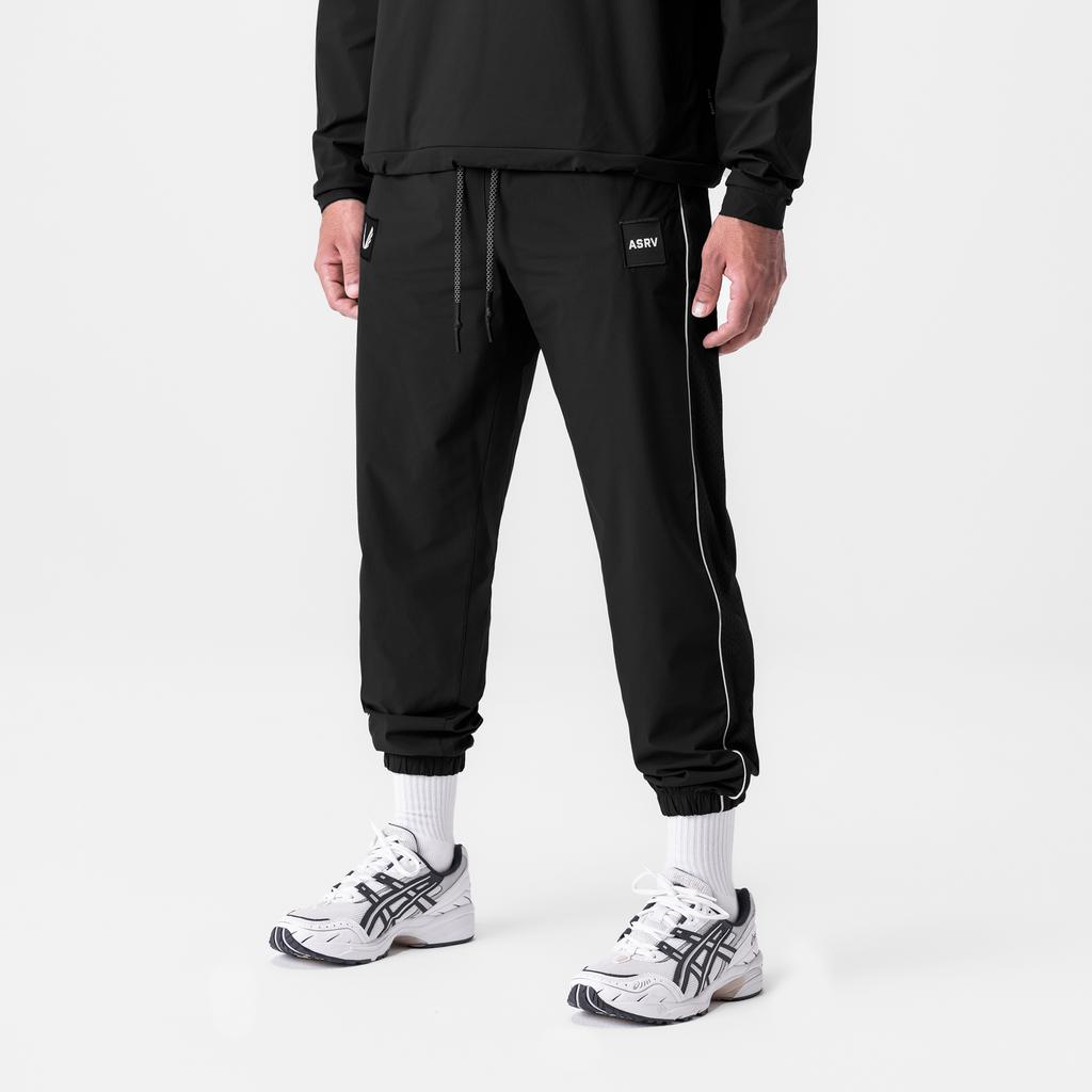 Oversized track pant made from durable mid-weight ripstop with four-way stretch. DWR water-resistant Right-side zip pocket Left-side hand pocket Mesh side paneling for ventilation 3M™ reflective drawstrings Patch branding on the front Reflective branding on the back of the right leg Model is 5'11 175lbs and wearing a size M.