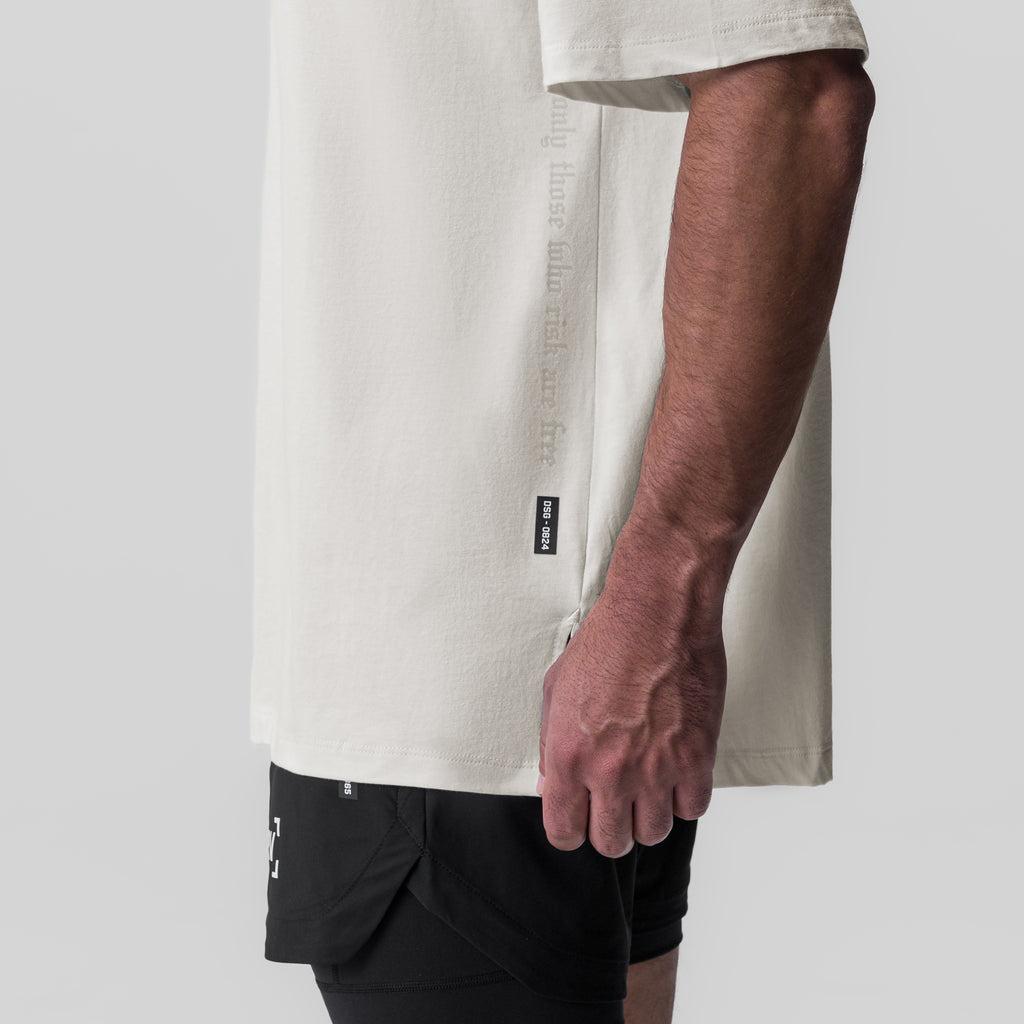 *Updated Fit: This shirt is designed with our new size specs, intended to give a truly oversized fit while taking your regular size. If you have purchased this shirt in the past and desire the same fit, we recommend taking a size down (i.e. if you took a Large, we recommend taking a Medium to achieve the same fit). Oversized hybrid training shirt constructed from Supima®, the world’s finest cotton. Supima® is incredibly soft and gets softer with each wash. We have combined with spandex to add stretch and finished it with Polygiene® anti-odor technology for performance. The shirt features a double-layer hex yoke seam across the upper back for durability in a high-movement area and side splits for increased range of motion. Complete match-color “only those who risk are free” text down the side body. Model is 5’11 170lbs and usually wears size M. This shirt is designed with an intentionally oversized fit, so he is wearing size M to achieve an oversized look.