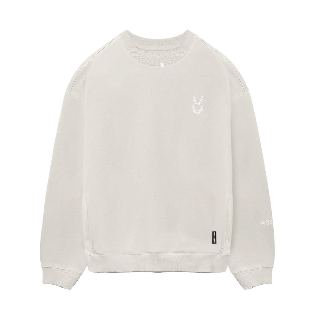 Warm-up crewneck with subtle distressing at the hems for a vintage aesthetic. Constructed from a soft fleece that is anti-odor and stone-washed for a worn-in feeling. Featuring ribbed side panels with hidden hand pockets on each side. Finished with embroidered branding on the chest and left sleeve. Model is 6'1 175lbs wearing a size M.