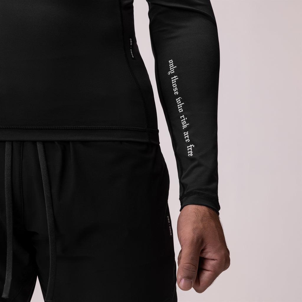 High-performance base layer for next-to-skin comfort. Sweat-wicking and four-way stretch. Raglan shoulder design for optimal range of motion. Articulated body gusset enhances ergonomics. Flatlock seams lay flat against the skin. “Only those who risk are free” mantra on the inner left sleeve. Reflective branding increase visibility at night. Polygiene® anti-odor technology. Model is 5’11 170lbs and usually wears size M. This product fits true to size with a tight, compression fit so he is wearing size M.