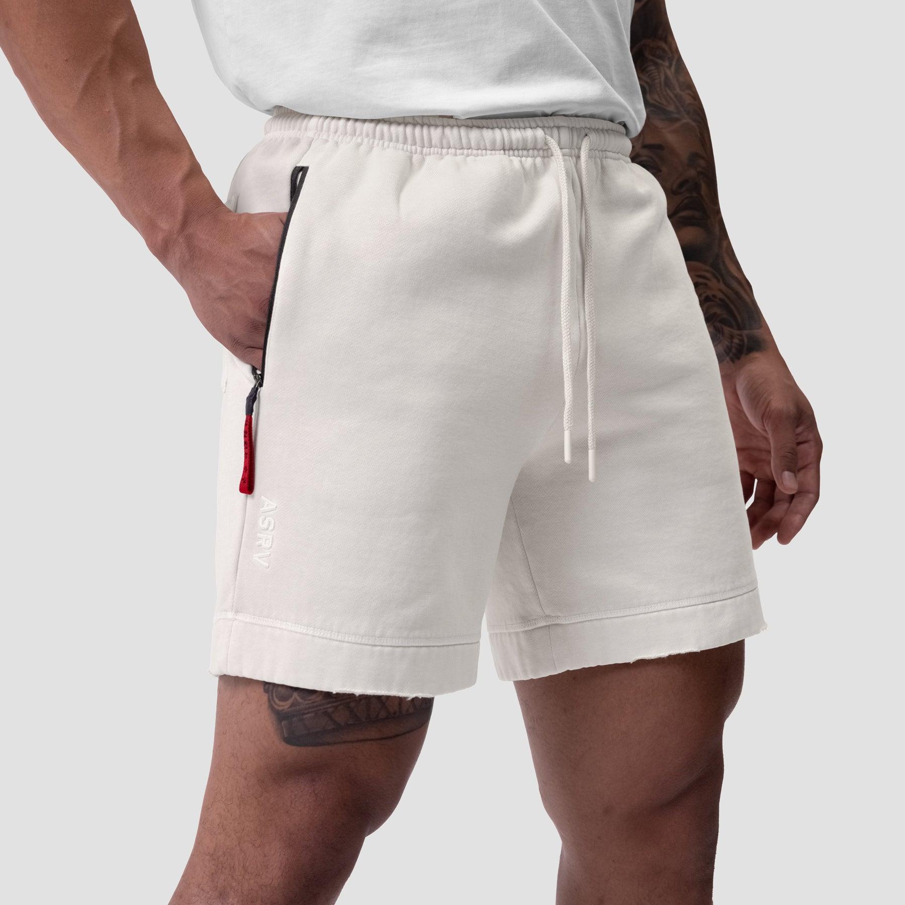 Vintage, relaxed-fit sweat shorts made from an updated midweight version of our Tech Essential™ fabric, an advanced cotton blend with SilverPlus® threads for added stretch and anti-odor functionality. Garment-dyed and stone-washed for a soft, broken-in feel, with light distressing at the seams and bottom hems. Features a right-side zip pocket with custom woven puller, a left-side open pocket, and a back overlay pocket. Finished with embroidered logos. Model is 5'11, 195lbs and wearing a size M