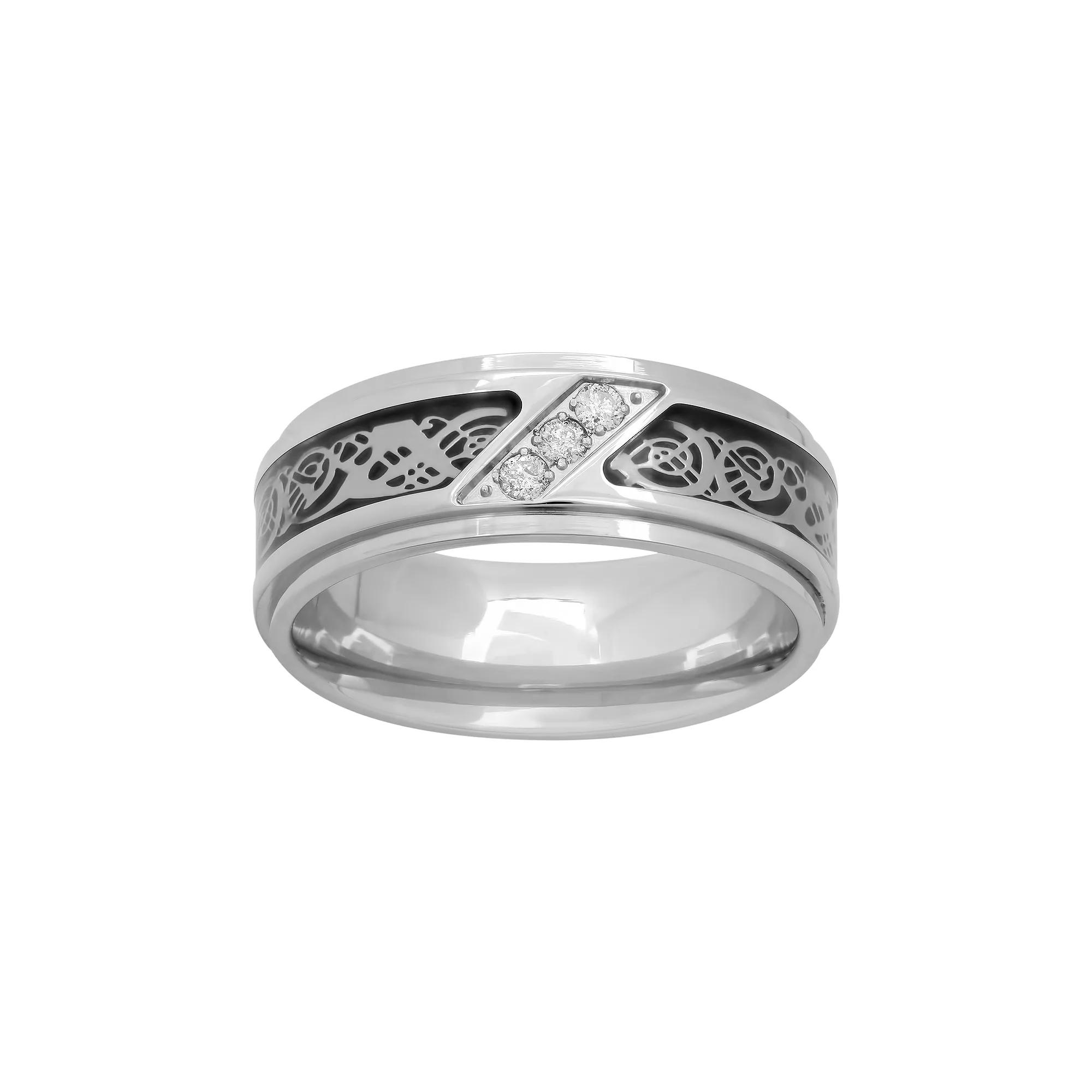 With an ornate Celtic dragon carbon fiber inlay accentuated with round-cut diamonds, this stainless steel band gives you unmatched style.RING DETAILS Width: 8 mm Metal: stainless steel Features: comfort-fit band DIAMOND DETAILS Total weight: 1/10 ct. Shape: round Color grade: I-J Clarity: I2-I3 Setting: prong Image(s) may be enlarged to show detail.Diamond weights are approximate. Diamond total weights may vary between .01 and .08 ct. Some diamonds have fewer than 17 facets. Gemstones may have been treated to enhance their appearance. Special care may be required. Please visit our Gemstone Treatment & Special Care Guide for more information. Size: 7.50. Color: White. Gender: male. Age Group: adult.