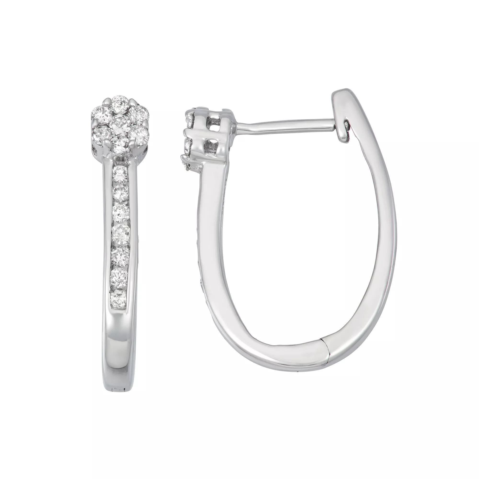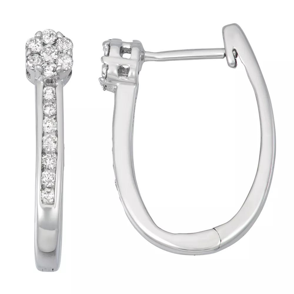 Put a sparkling final touch on your look with these diamond oval hoop earrings. Put a sparkling final touch on your look with these diamond oval hoop earrings. Nickel free Metal: sterling silver Backings: click-it Packaging: boxed Plating: rhodium Finish: polished Length: 19 mmDIAMOND DETAILS Total weight: 1/3 ct. Color grade: H-I Clarity: 11-12 Shape: round Setting: channel, tension Diamond weights are approximate. Diamond Total Weights may vary between .01 and .13 ct. Some diamonds consist of fewer than 17 facets. Gemstones may have been treated to enhance their appearance. Special care may be required. Please visit our Gemstone Treatment & Special Care Guide for more information. Image(s) may be enlarged to show detail. Please note, due to the high value of this item, a signature may be required upon delivery. Size: One Size. Color: White. Gender: female. Age Group: adult.