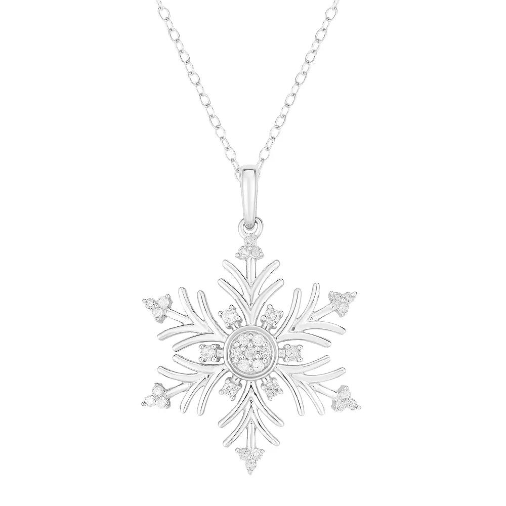 Featuring a snowflake pendant adorned with scintillating diamond accents, this sterling silver necklace adds an enchanting touch to any outfit. Featuring a snowflake pendant adorned with scintillating diamond accents, this sterling silver necklace adds an enchanting touch to any outfit. NECKLACE DETAILS Pendant size: 1.06" x 3/4" Chain length: 18" Chain type: cable Clasp: safety clasp Metal: sterling silver Packaging: boxed Additional details: nickel freeDIAMOND DETAILS Total weight: 1/5 ct. Shape: round Color: white Setting: prong Clarity: I3 Color grade: I Gemstones may have been treated to enhance their appearance. Special care may be required. Please visit our Gemstone Treatment & Special Care Guide for more information. Diamond weights are approximate. Diamond total weights may vary between .01 and .08 ct. Some diamonds have fewer than 17 facets. Image(s) may be enlarged to show detail. Gender: female. Age Group: adult.
