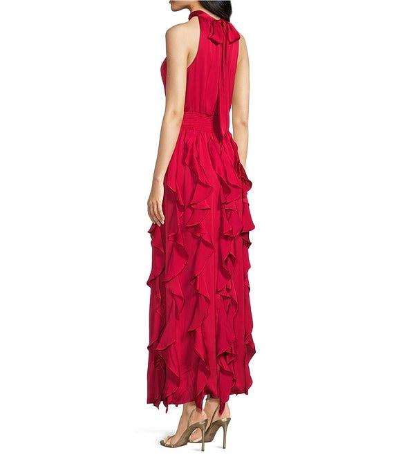 1. STATE Mock Neck Sleeveless Ruffle Maxi Dress