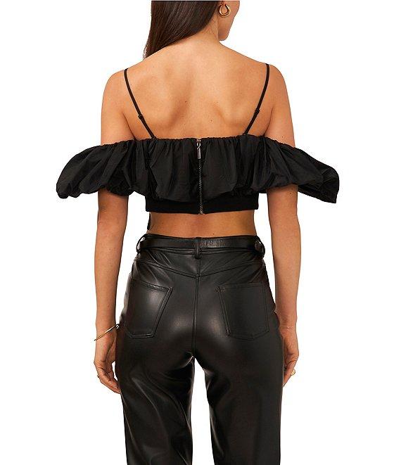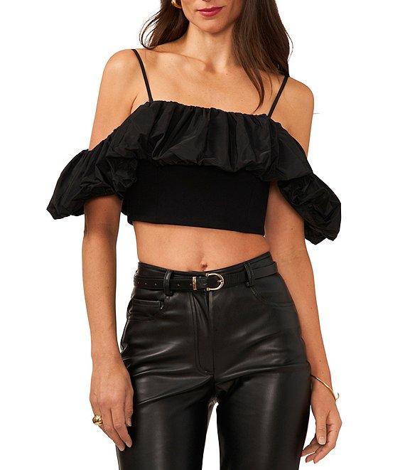 1. STATE Taffeta Bubble Off-the-Shoulder Short Sleeve Cropped Ponte Top