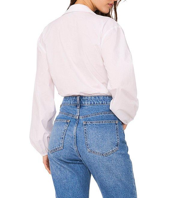 From 1. STATE, this bodysuit features: Woven fabrication Collared v neckline Long sleeves with elastic bottoms Wrap silhouette Button closure Approx. 23" in length Cotton/polyester/spandex Machine wash/tumble dry Imported.