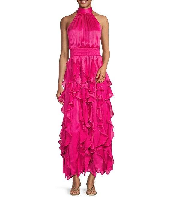 1. STATE Woven Halter Mock Neck Sleeveless Ruffle Maxi Dress