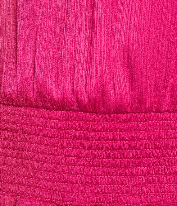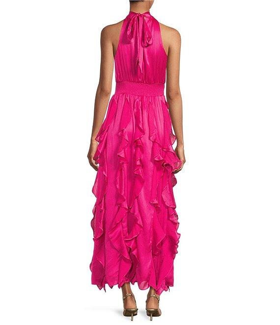 From 1. STATE, this dress features: Woven fabrication Halter mock neckline Sleeveless Ruffle details LinedTie back closureApprox. 56.5" in length Polyester Machine washImported.