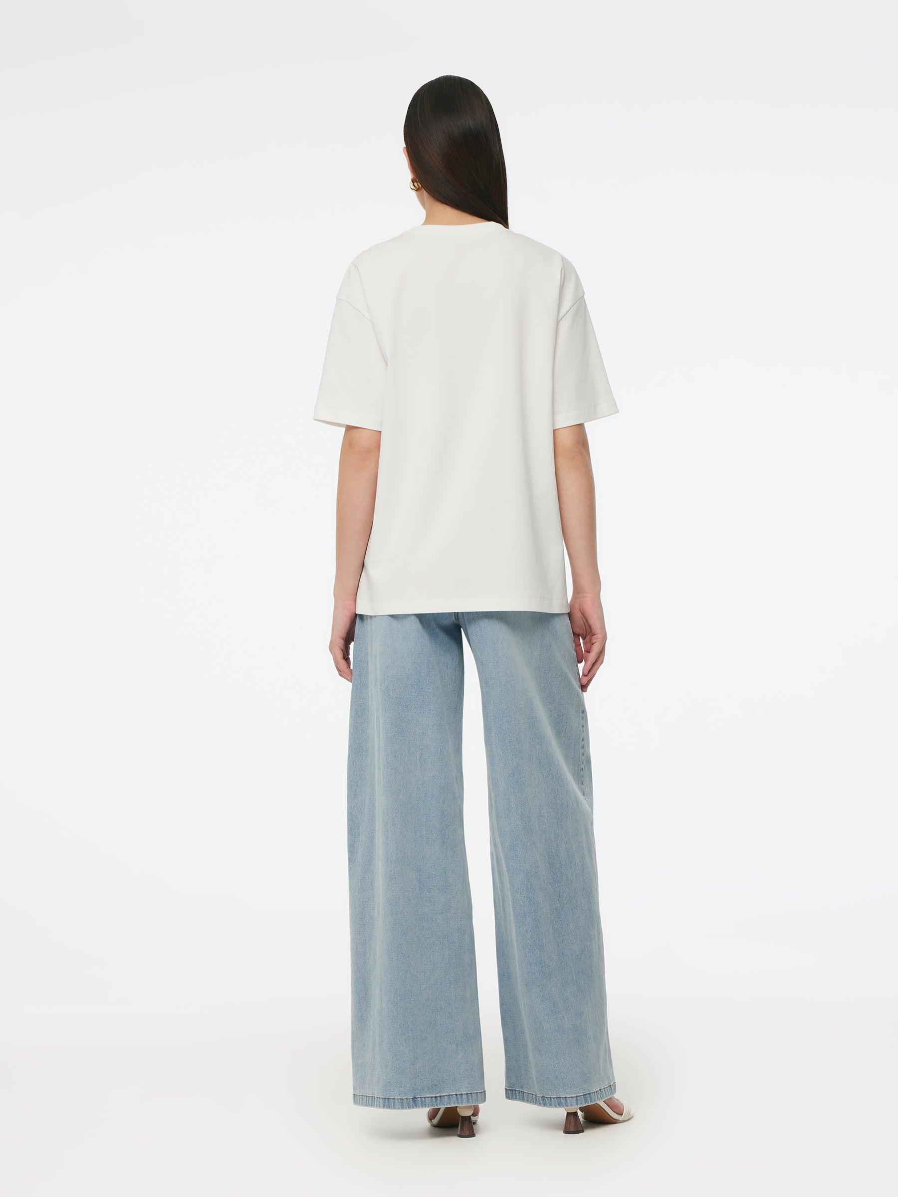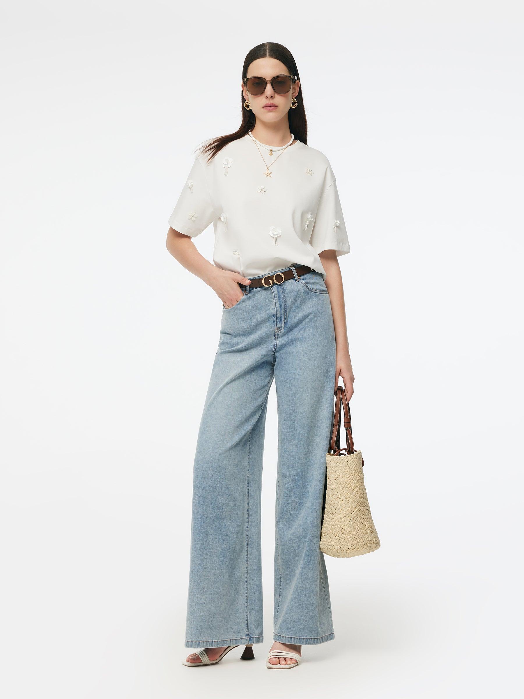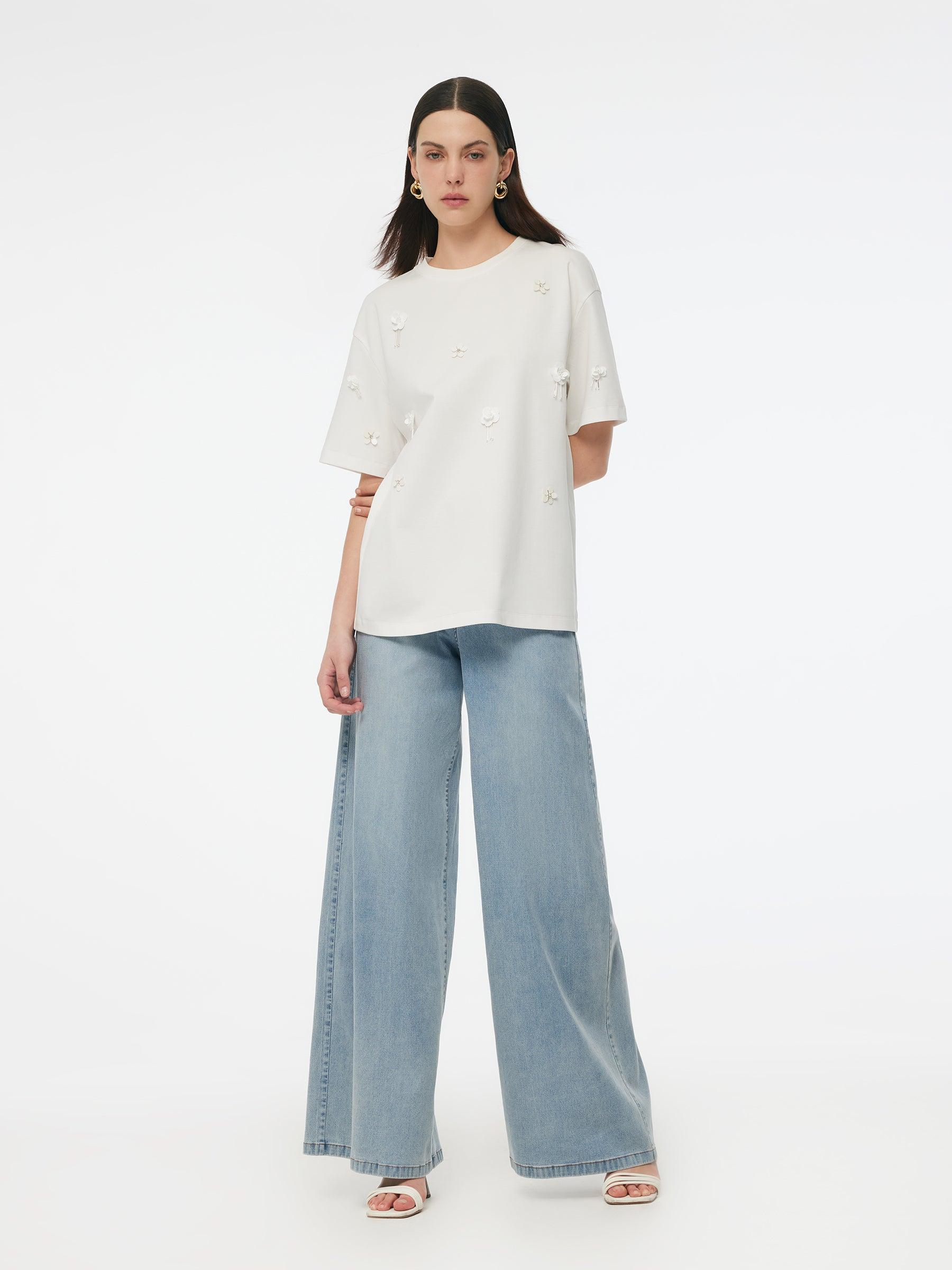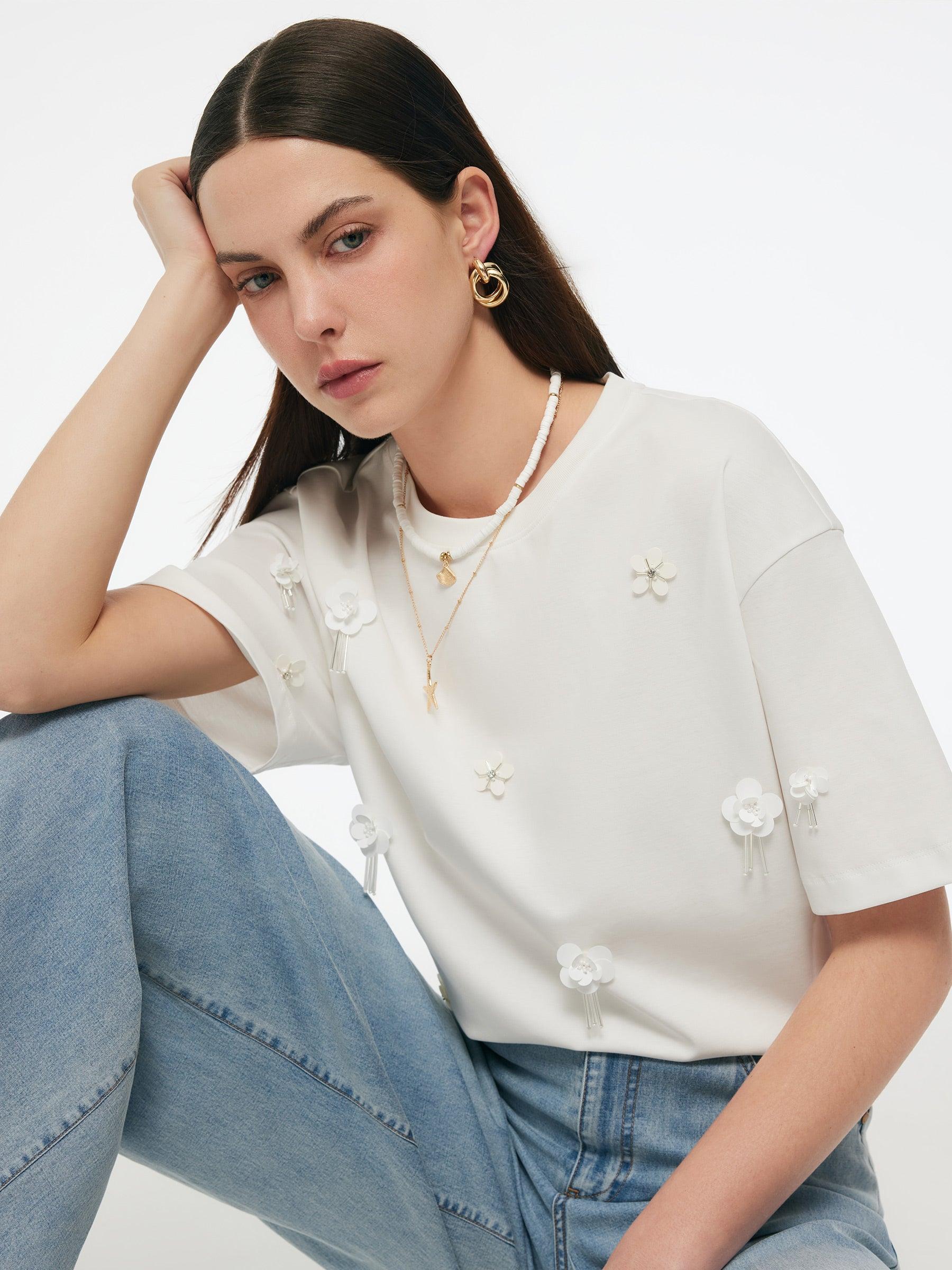 -100% Cotton -Loose fit -Breathable and soft This refined t-shirt gets a modern update with 100% cotton fabric and delicate floral beads. Soft and breathable cotton fabric offers a skin-friendly experience perfect for daily wear. The loose, H-line cut flatters all body types. With a classic ribbed neckline and dropped
