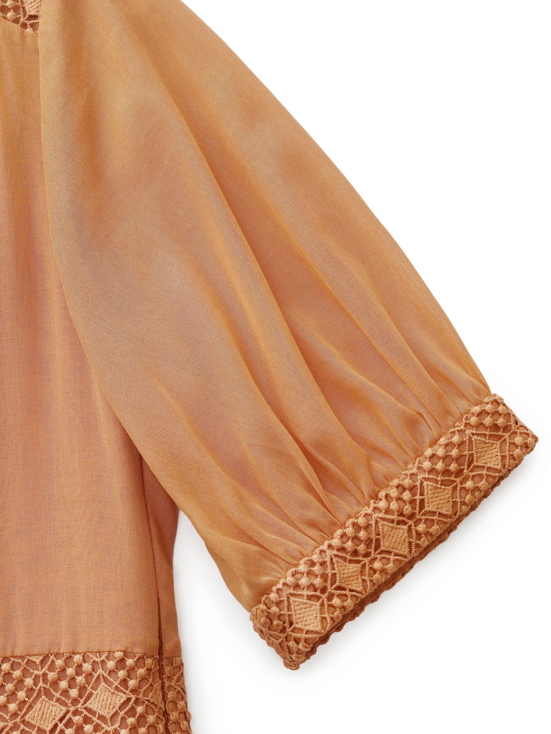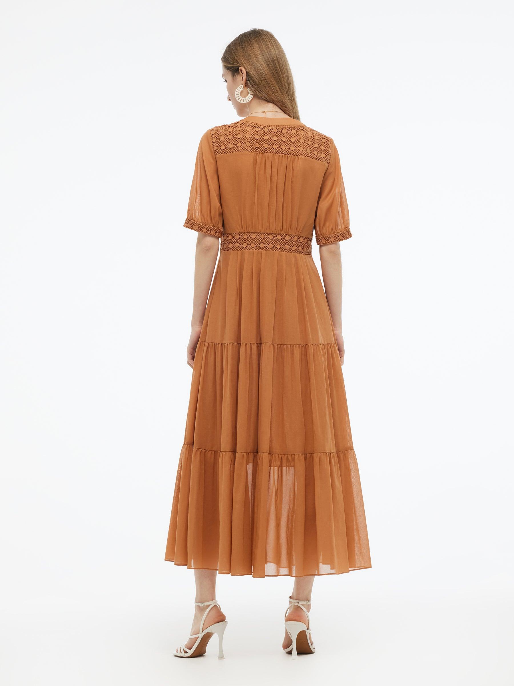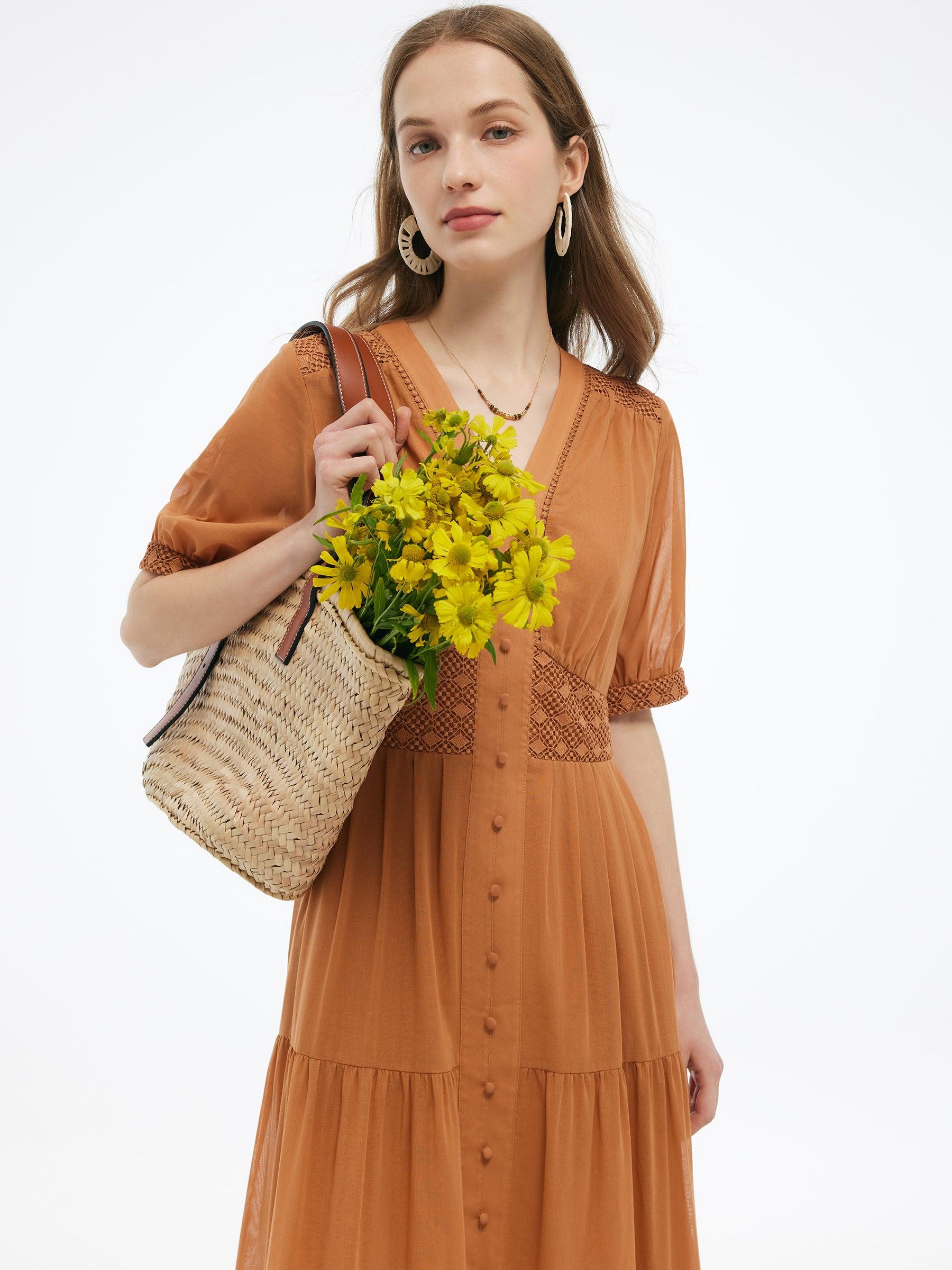 -100% Cotton -A-line fit -V-neck This sophisticated piece designed with patchwork and laced embroidery shows a renewed take on the classic maxi dress. Made from 100% cotton voile, this dress offers the comfort of natural fibers and an eco-friendly touch. The A-line silhouette gracefully flares out from the waist, while