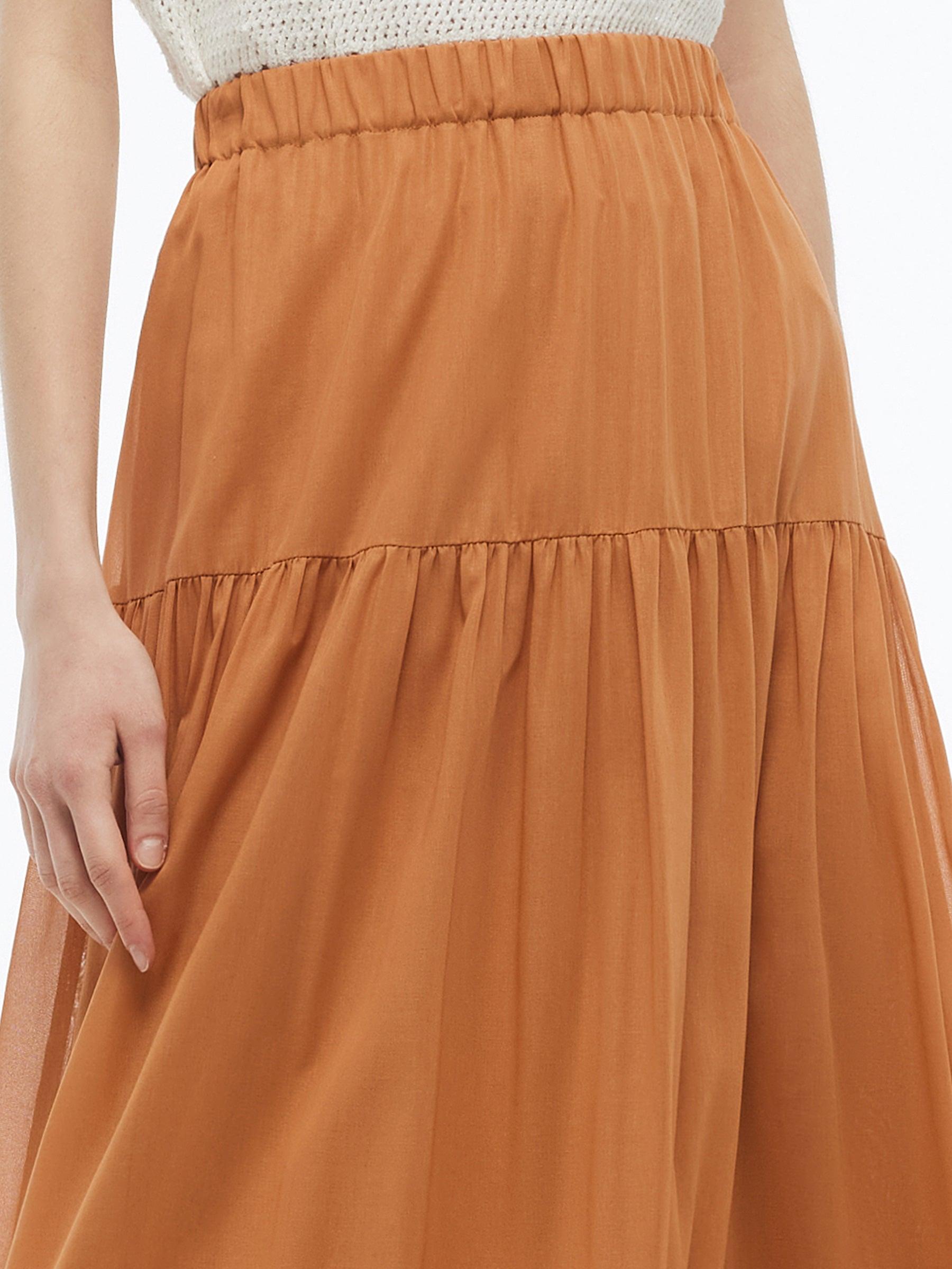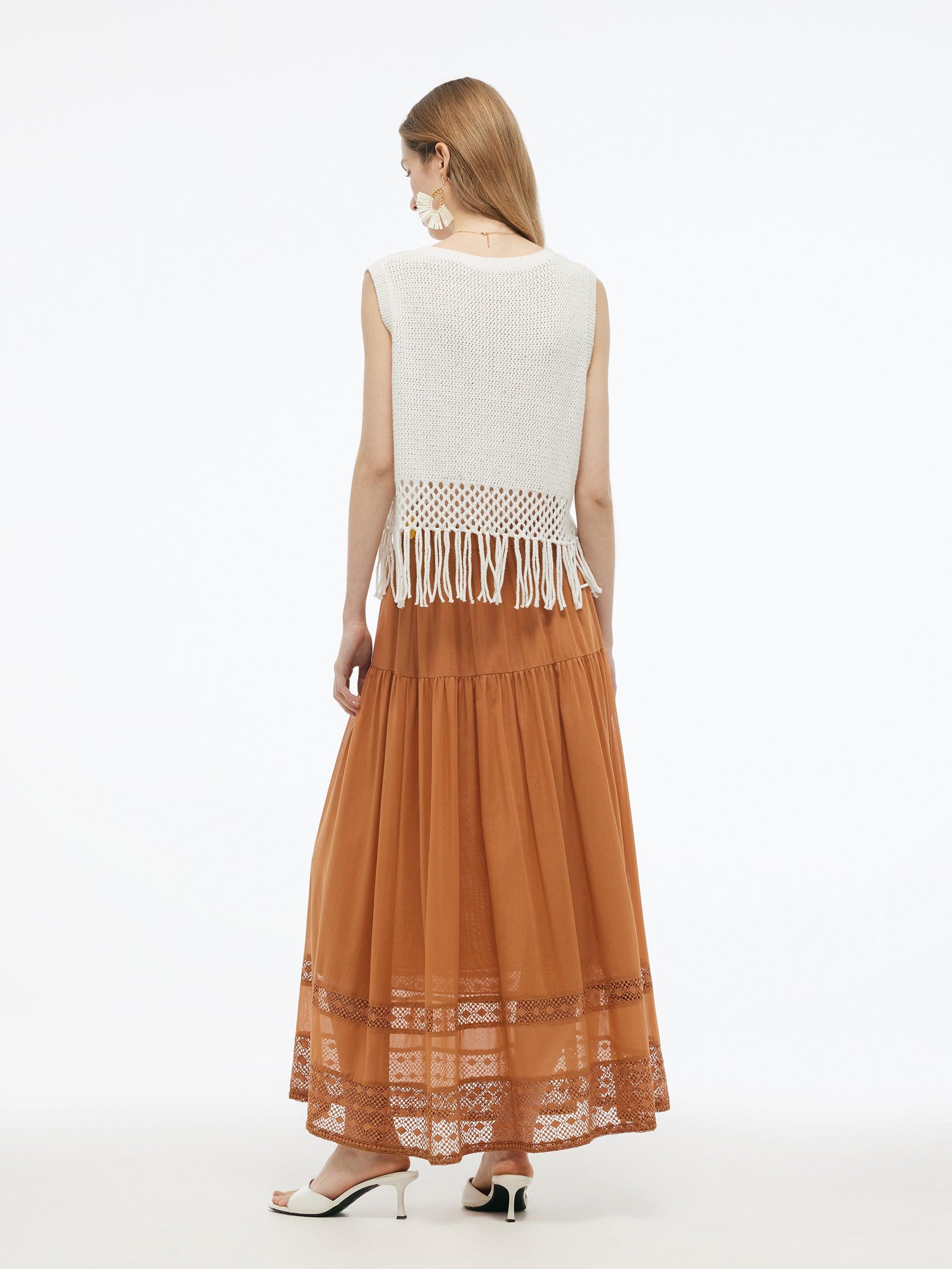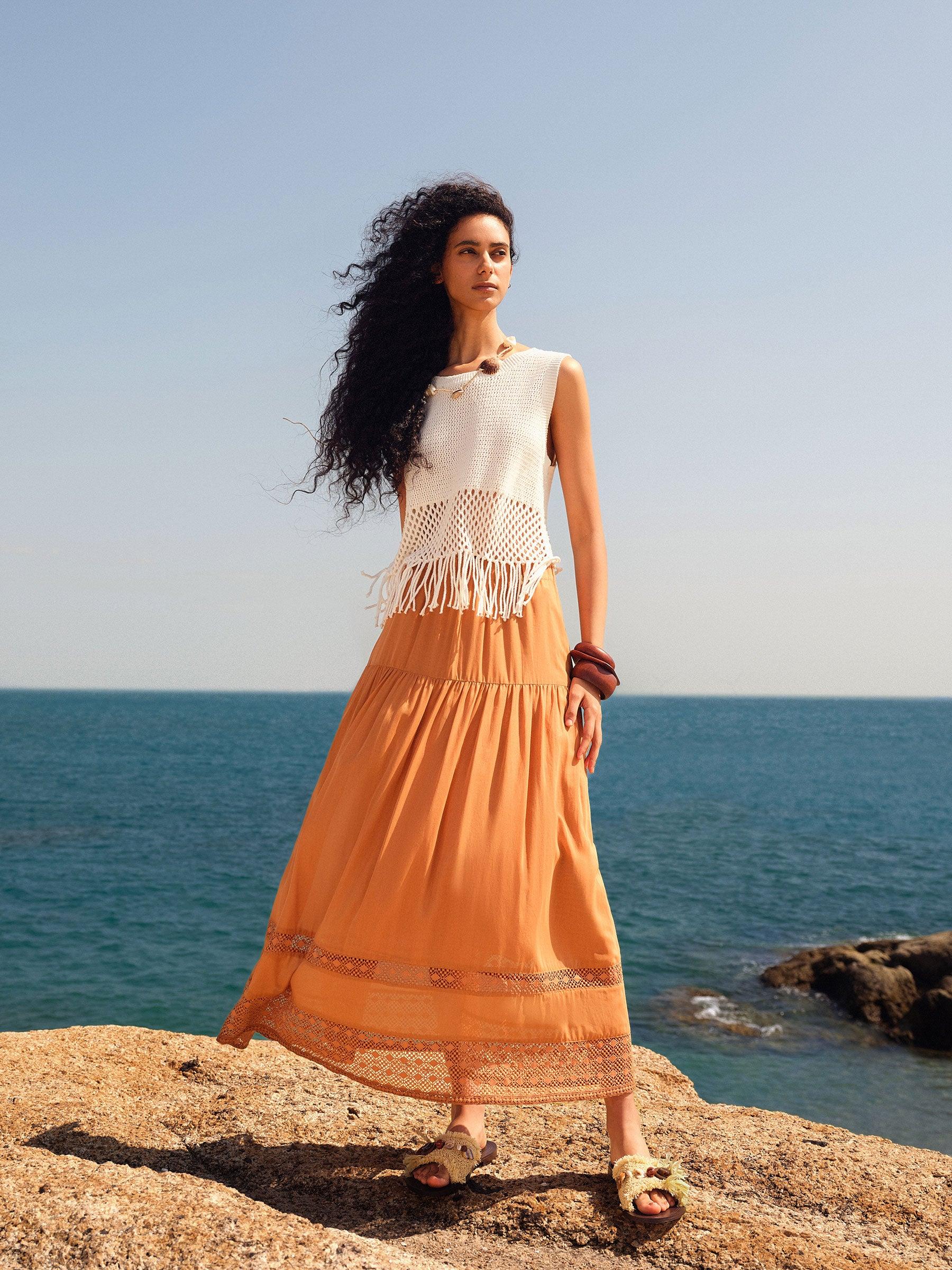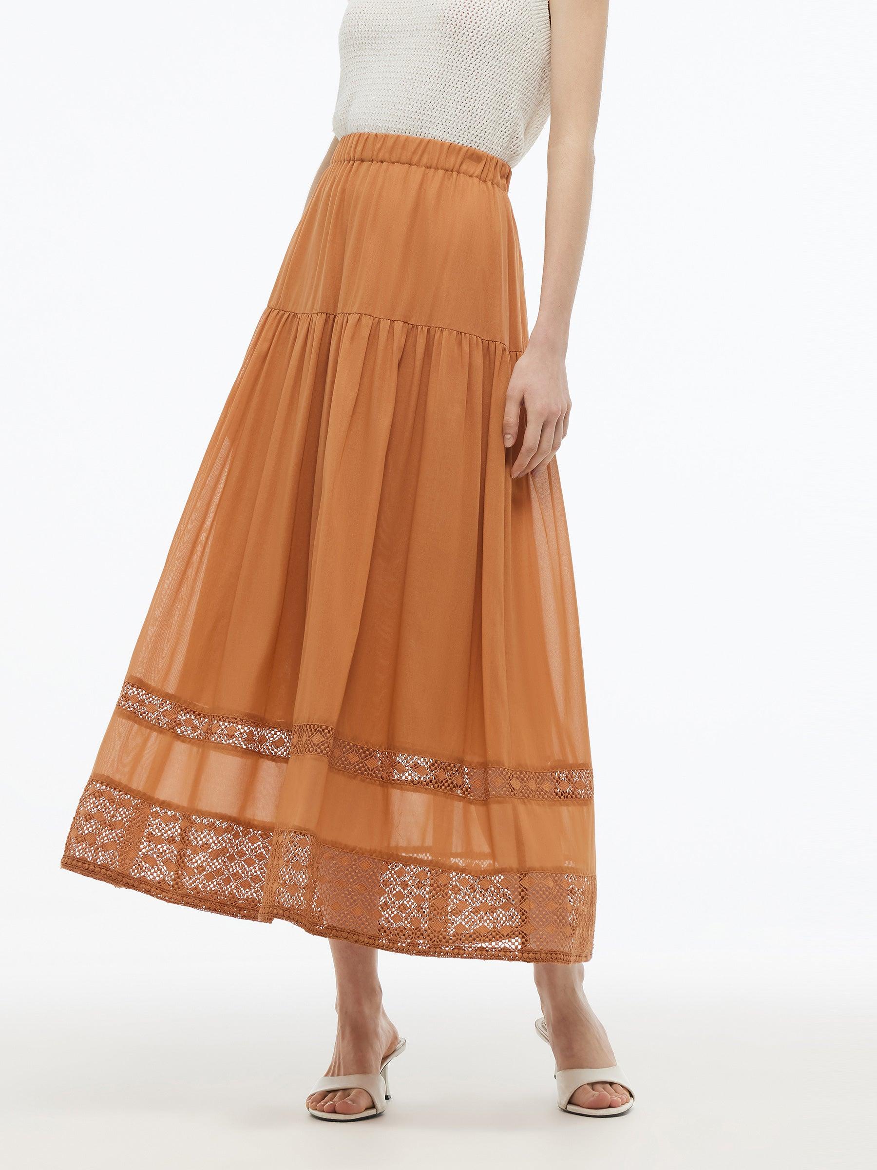 -100% Cotton -With elastic waistband -With pockets Uncover the charm of effortless chic with this skirt. Fabric of 100% cotton offers eco-friendliness and extreme natural softness. The knee-length design showcases the legs while maintaining a modest, elegant look, while delicate lace trim at the hem adds texture and vi