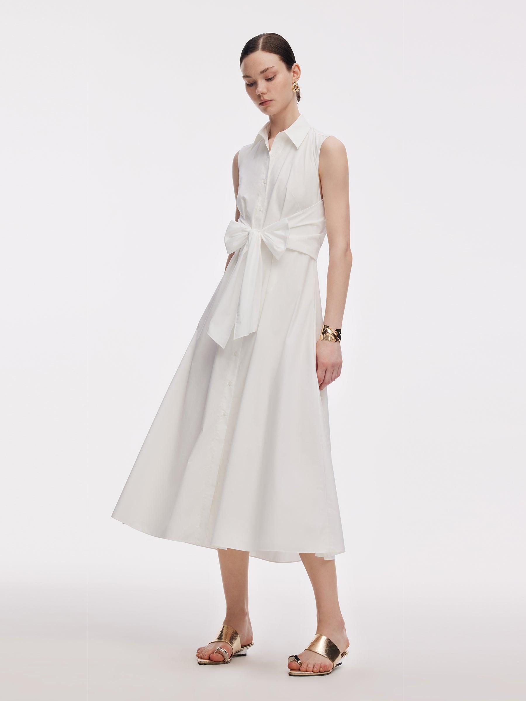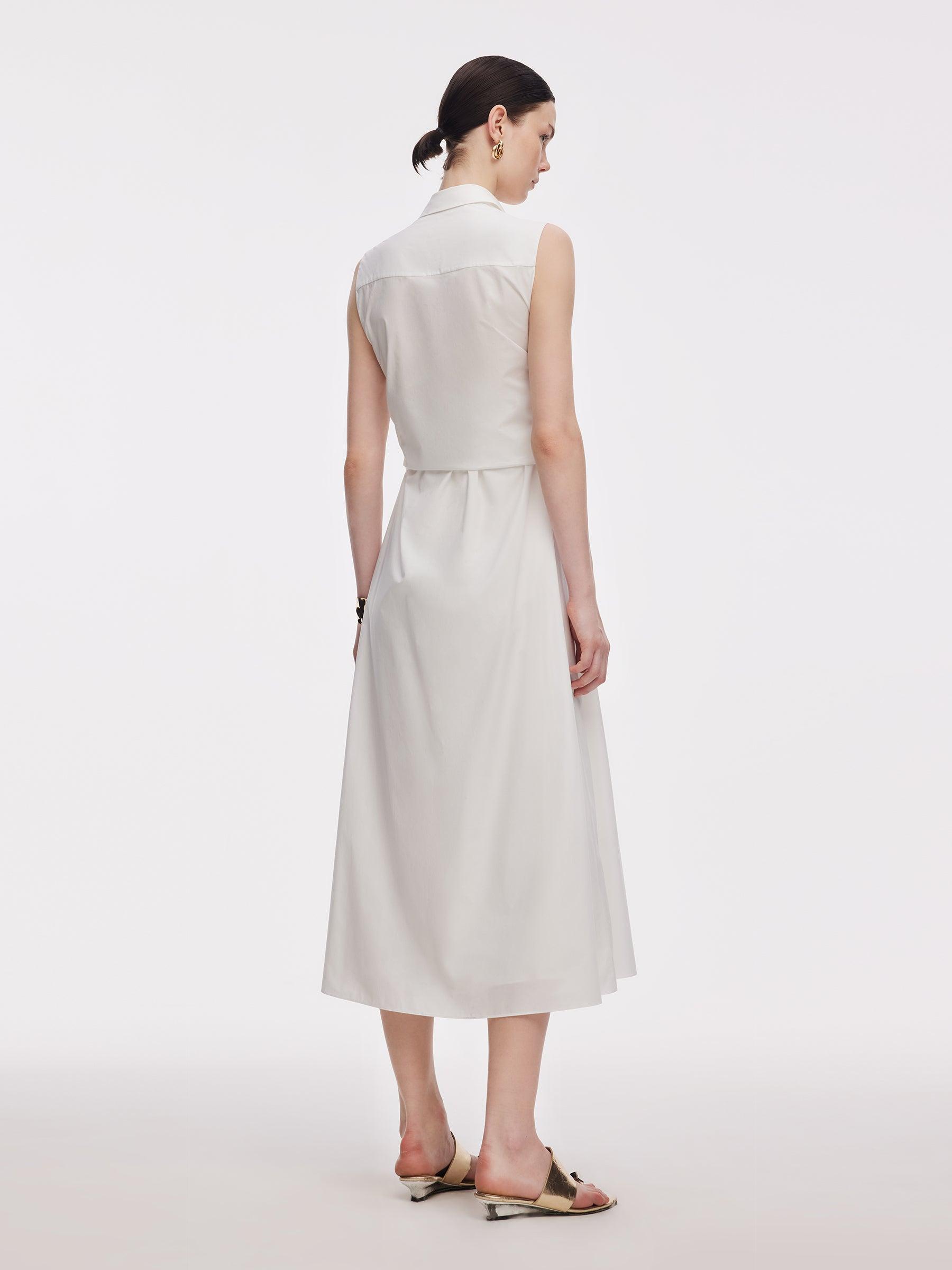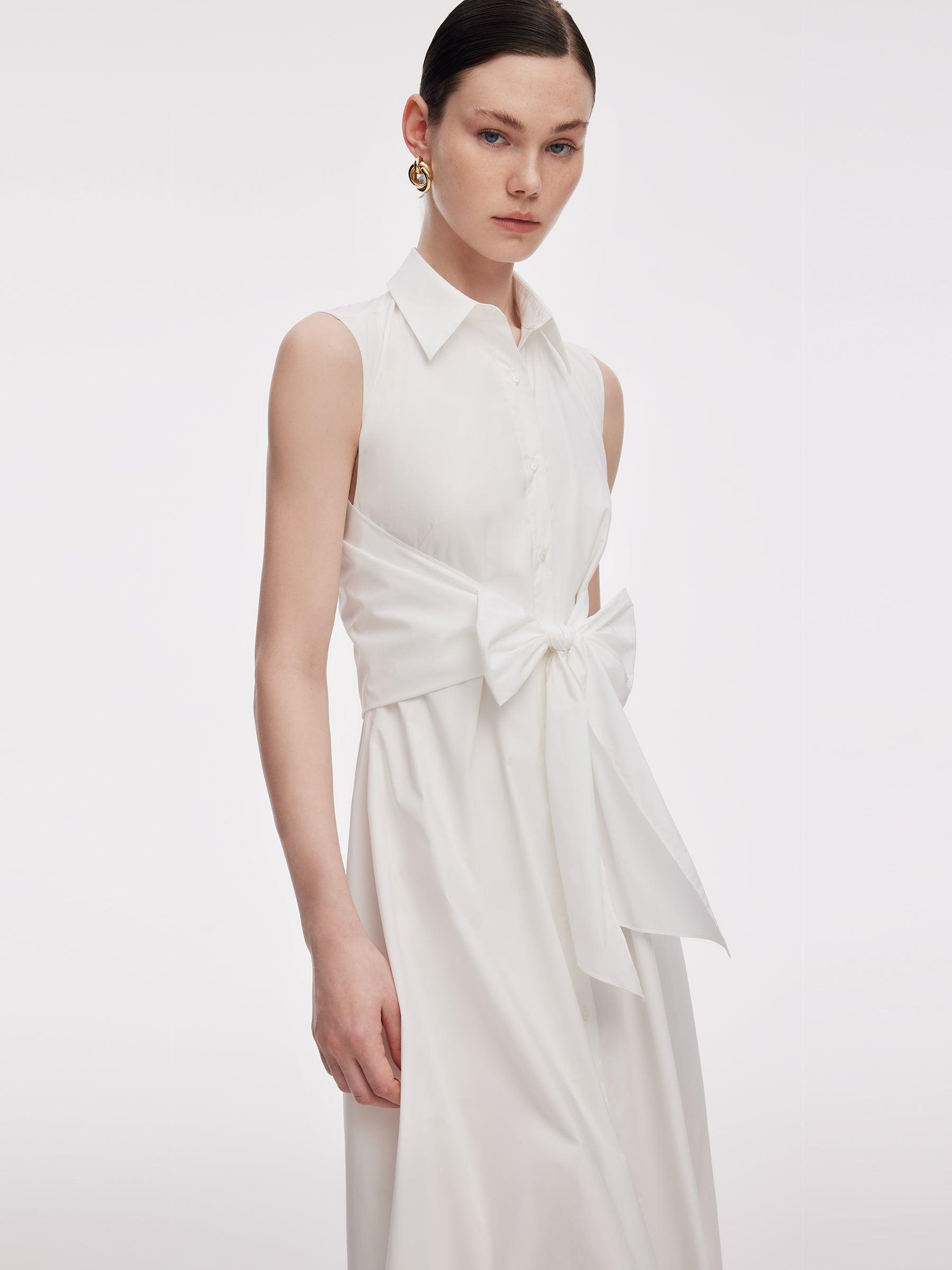 -100% Cotton -With pockets -X-line fit Reimagining the classic shirt dress, this 100% cotton maxi vest shirt dress is designed with a front tie that cinches your waist beautifully. Side pockets add practicality, and the full front button closure ensures versatility in styling, making it an effortless choice for transit