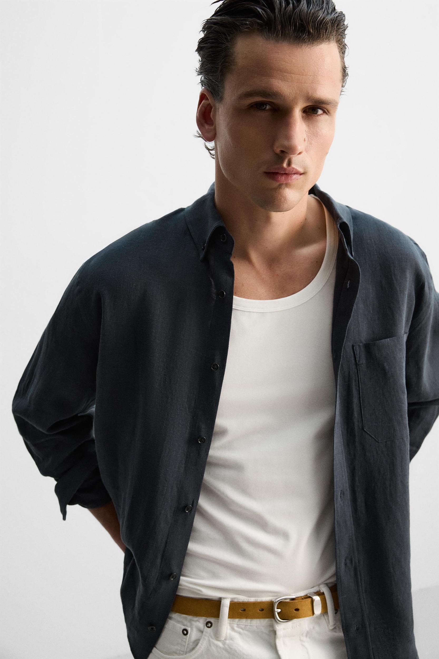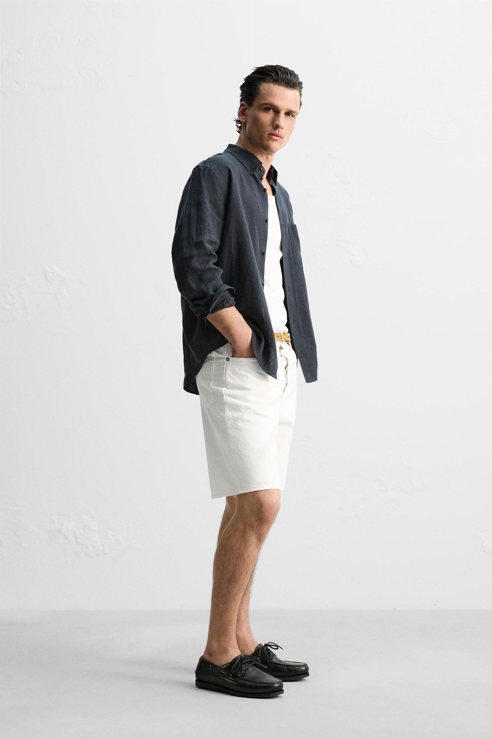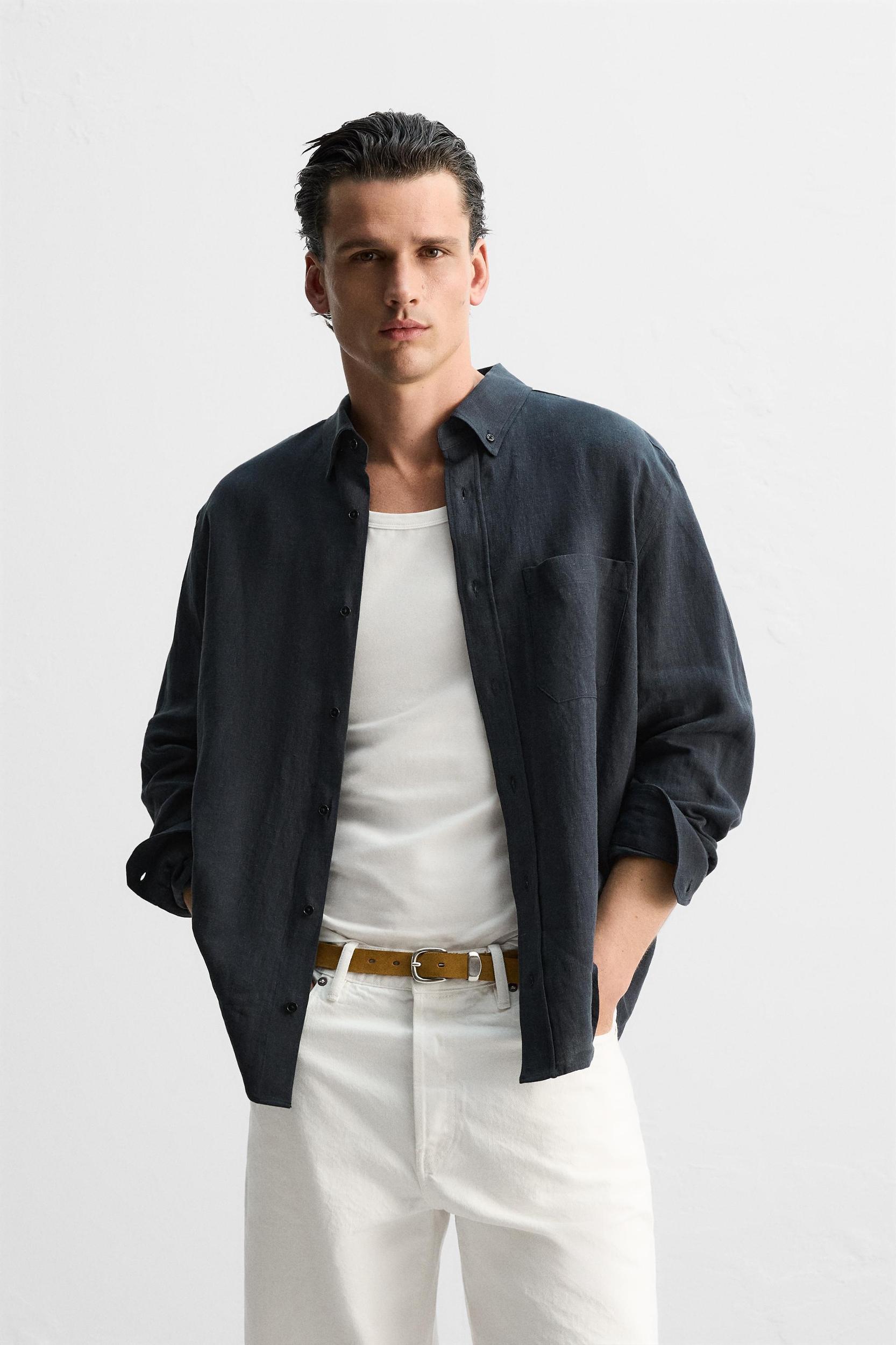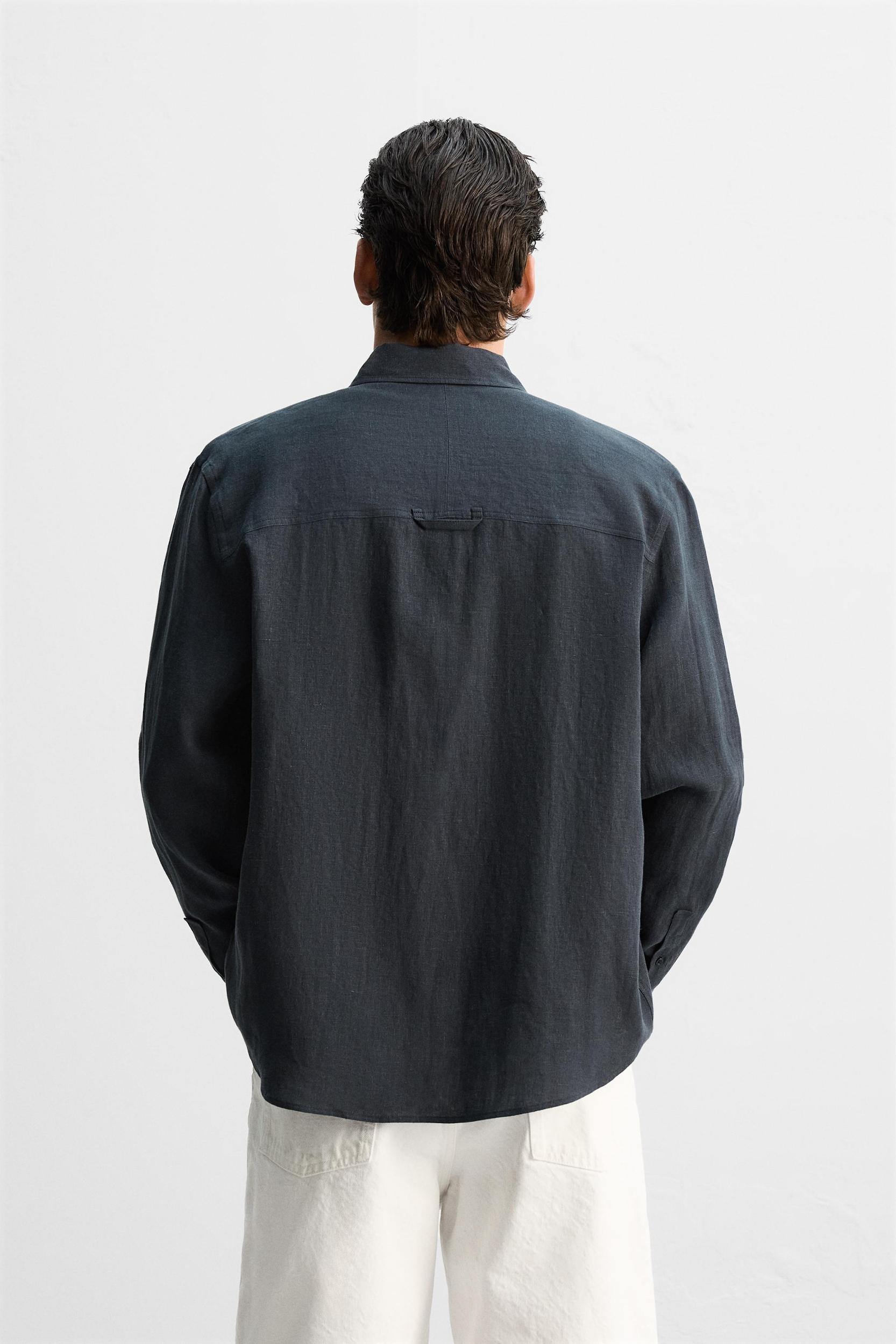 Relaxed fit shirt made of linen fabric. Button-down collar and long sleeves with buttoned cuffs. Patch pocket on chest. Front button closure.