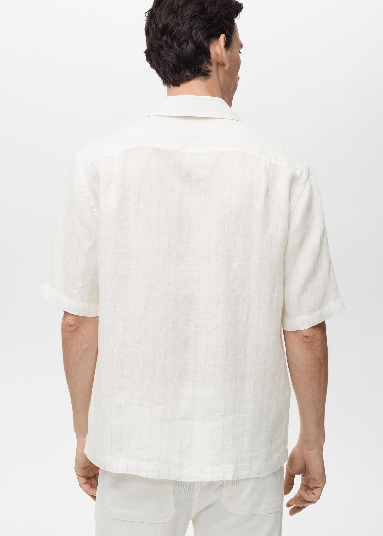 100% linen fabric. Pinstripe design. Bowling collar. Front button closure. Two patch pockets at chest. Back dart detail. Straight hem with side slits. Model is 190 cm and wears size M. Side length 18.07 in. Back length 30.31 in