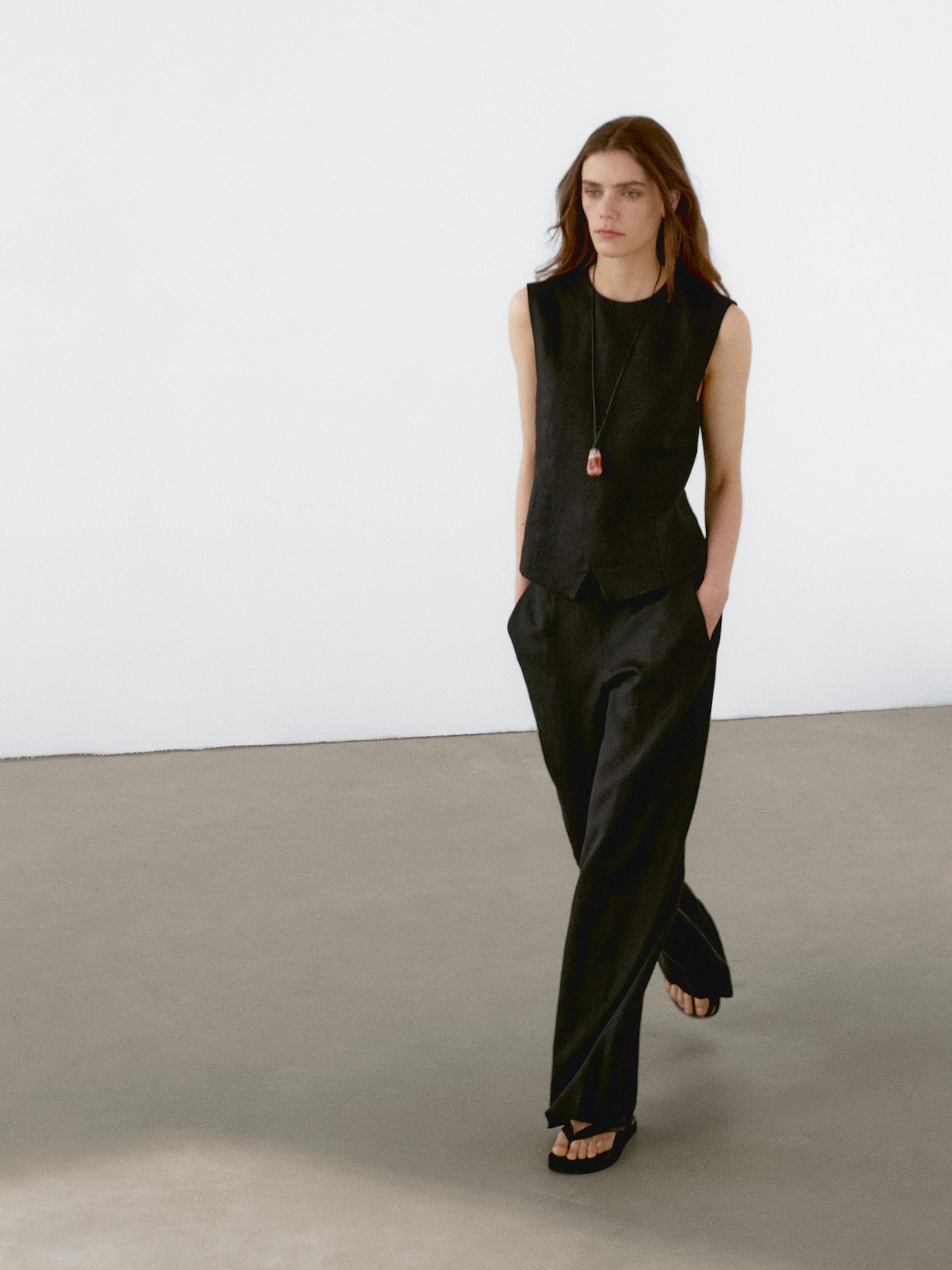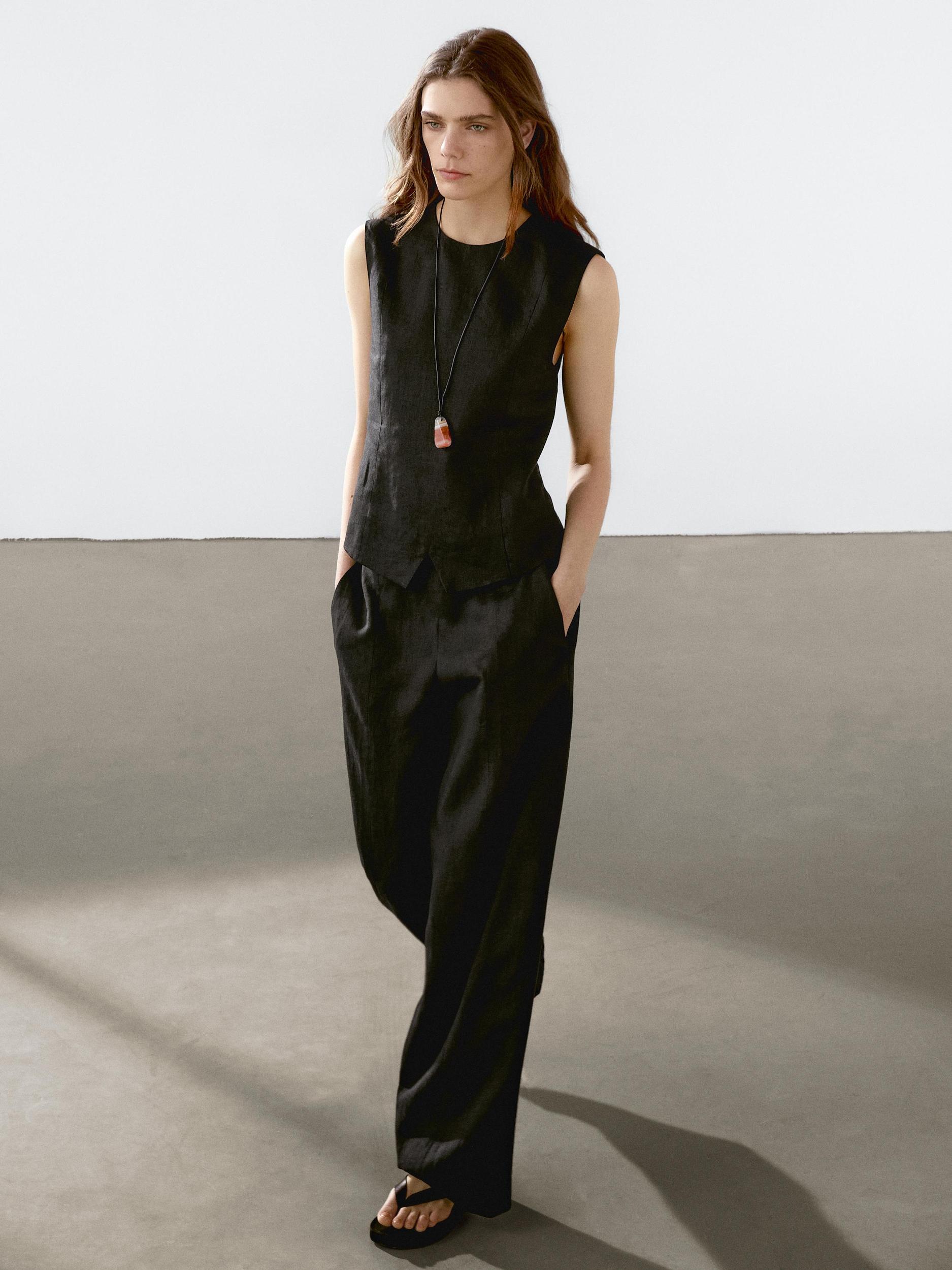 Waistcoat made of 100% linen fabric , Crew neck, Sleeveless, Front opening, Adjustable rear cinch strap, Cotton lining, Seam details