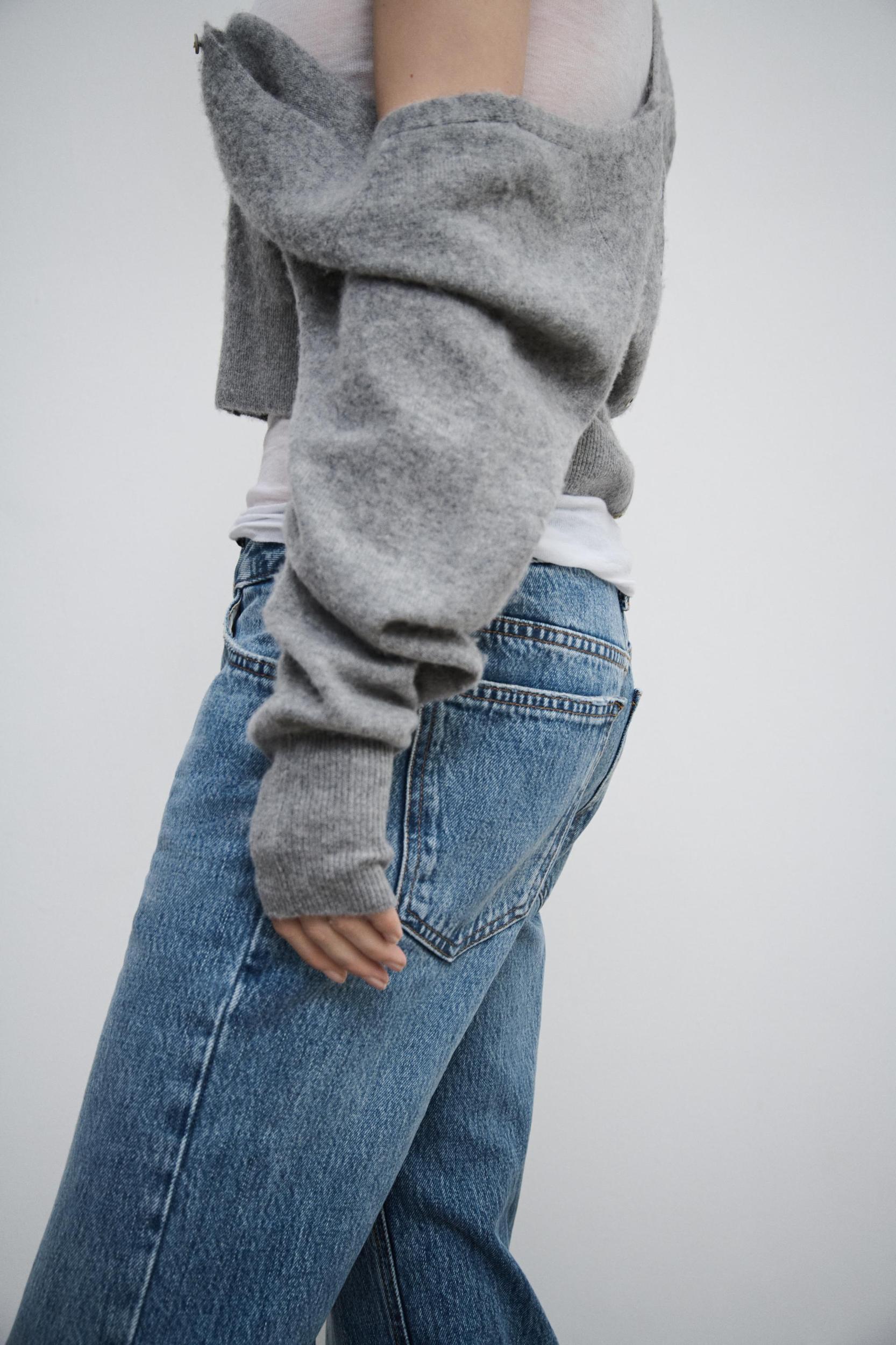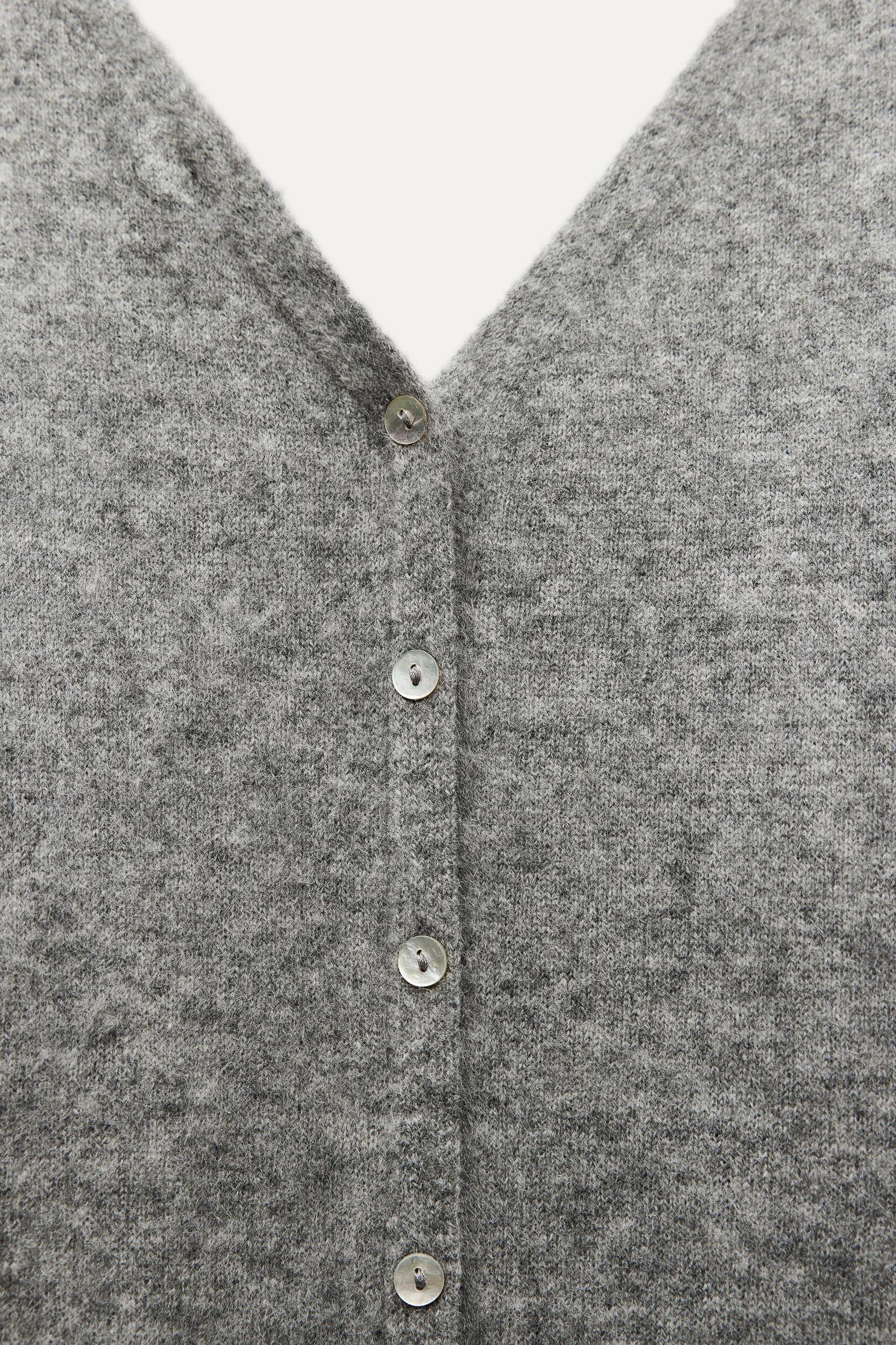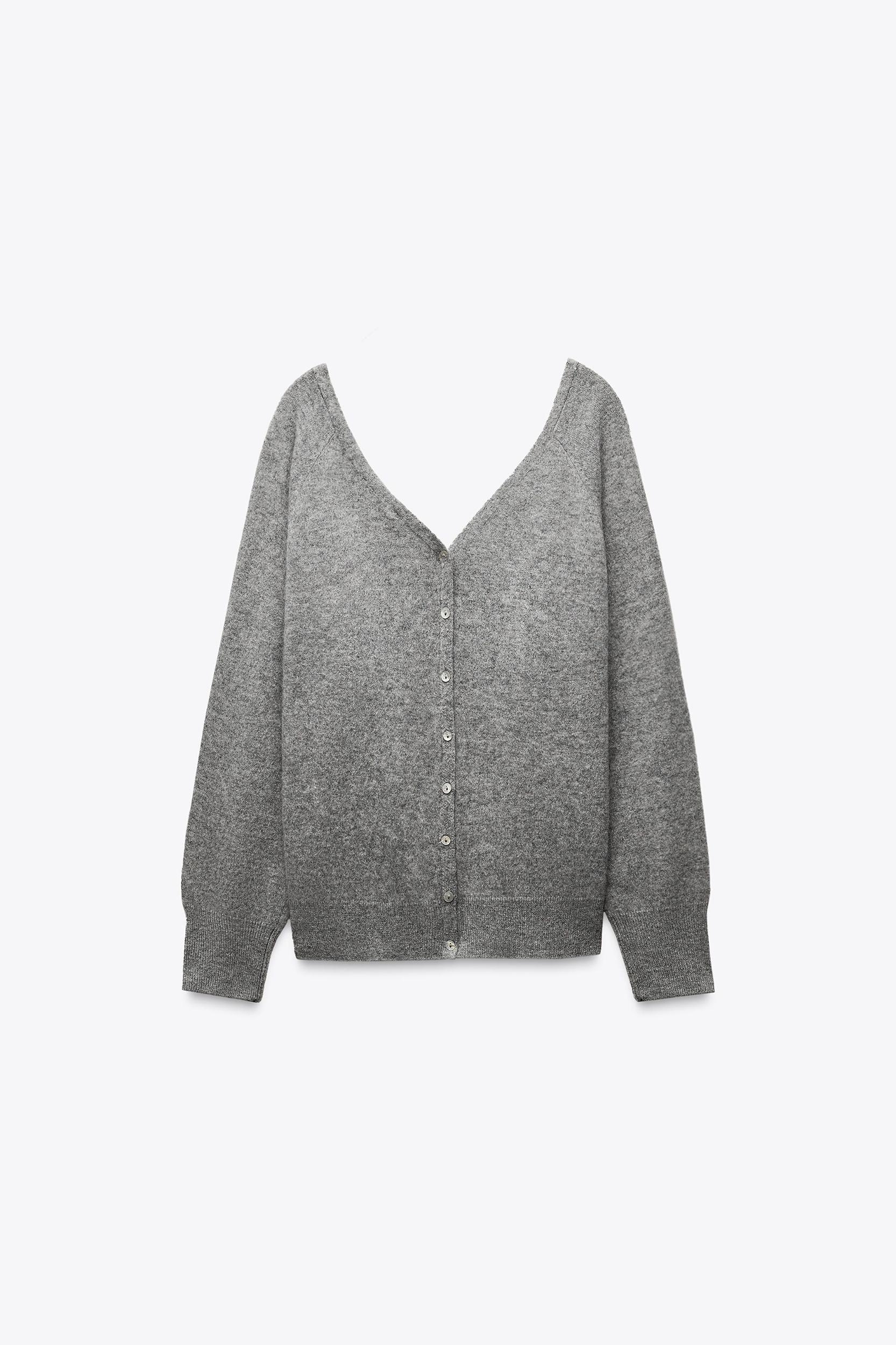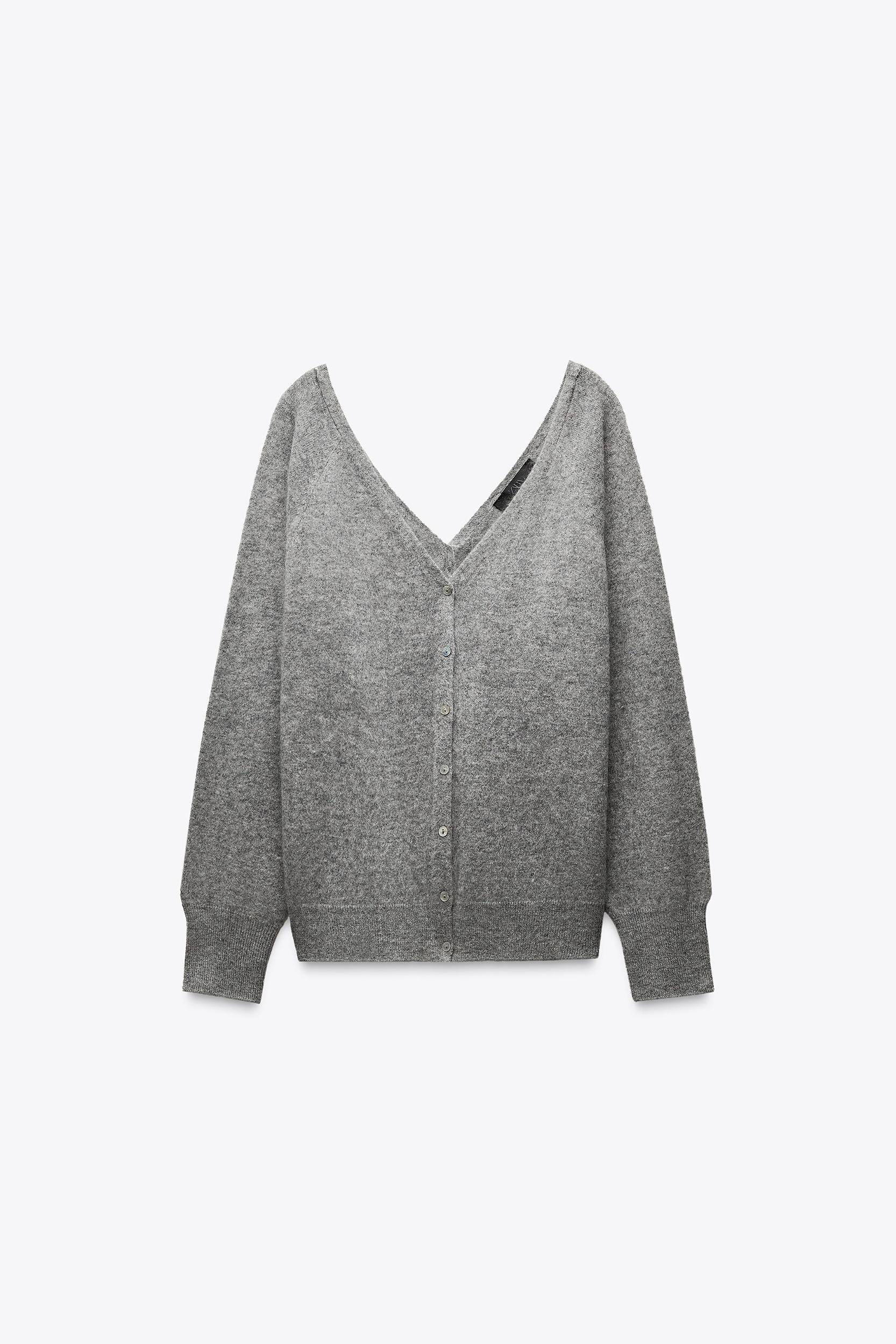 Sweater made of 100% wool. V-neck in front and back. Long sleeves. Decorative back buttons. Front button closure.