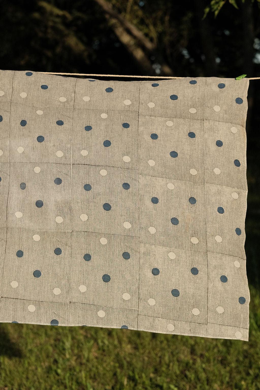 Discover effortless style with our unique Chic Dots & Stripes Bandana. This charming accessory showcases a sophisticated pattern of delicate vertical lines accented by playful, scattered polka dots in contrasting deep blue and cream. The subtle texture of the fabric lends a handcrafted touch, making each piece uniquely appealing.