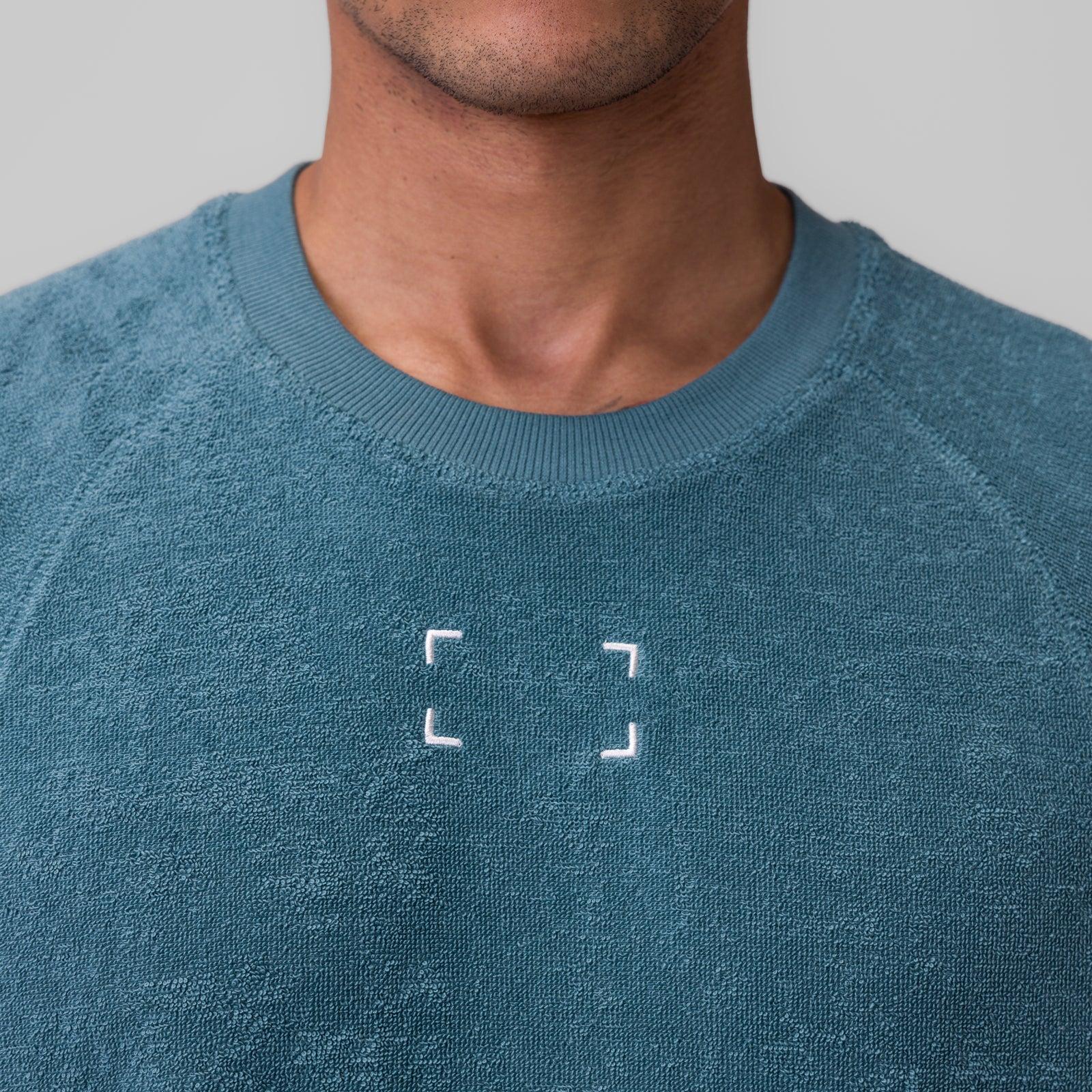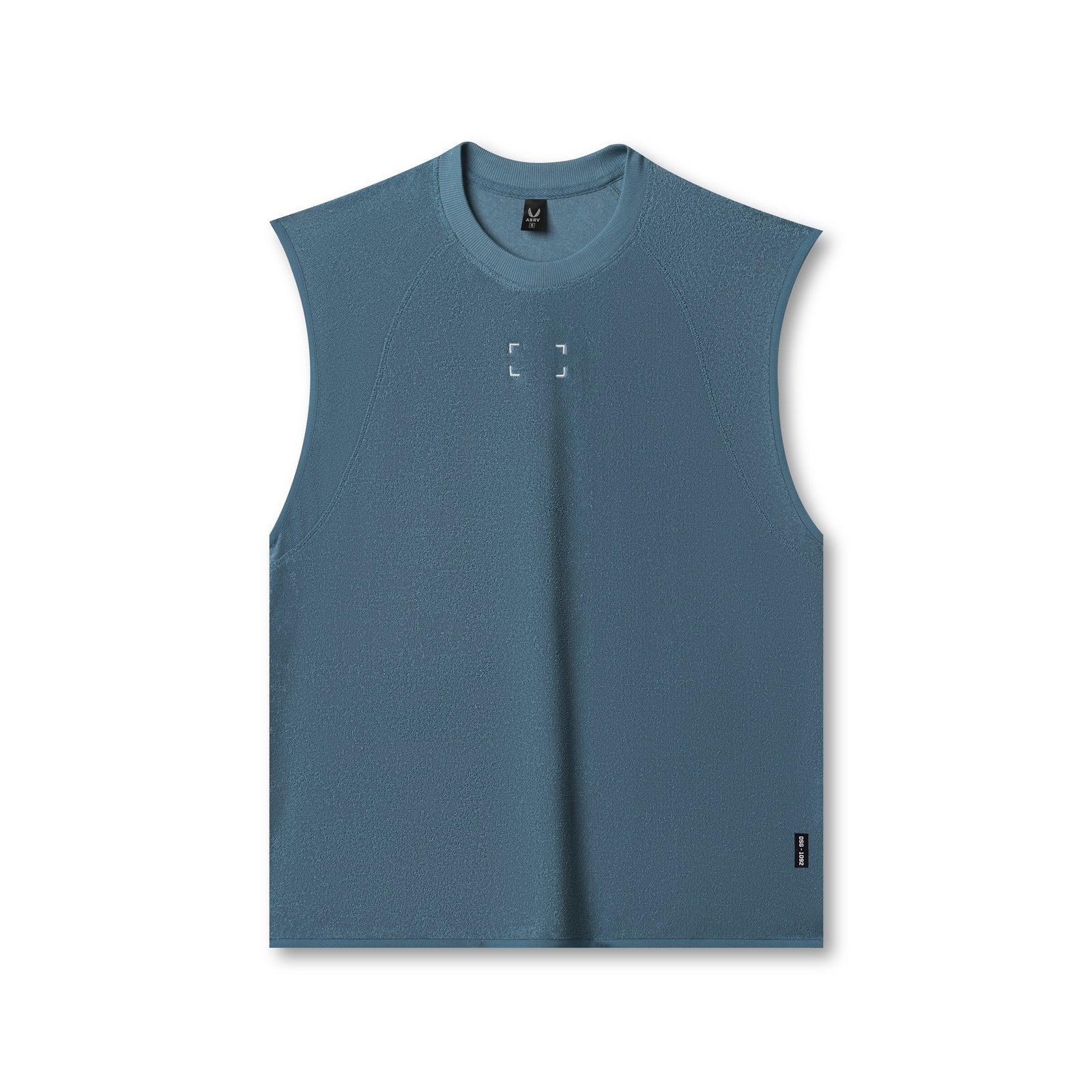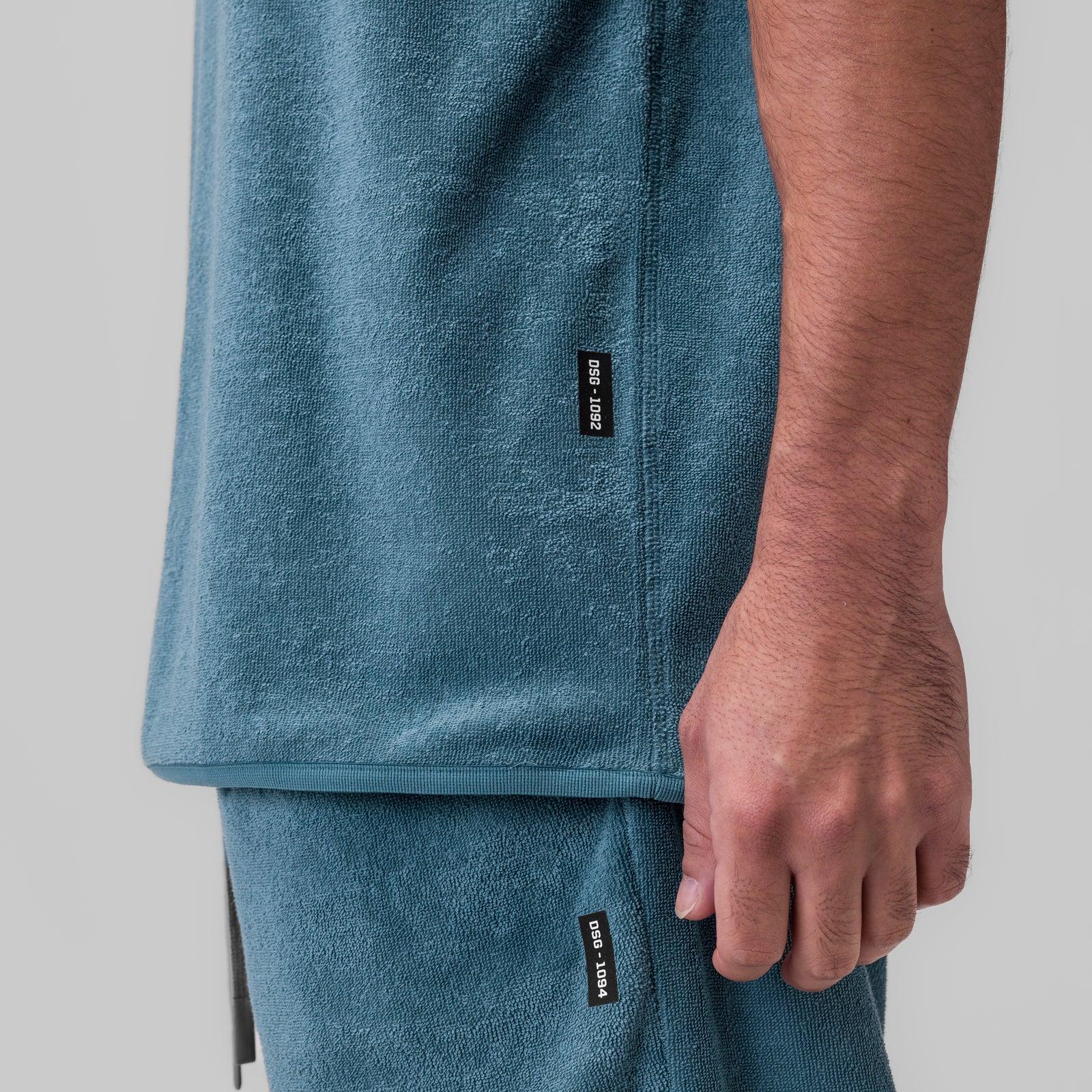 Oversized cutoff designed for recovery and post-training comfort. Constructed from soft, breathable Towel Terry with a textured finish for relaxed wear. Features binding at the sleeves and hem, reflective heat-press vents for airflow, and an embroidered back logo down the spine.