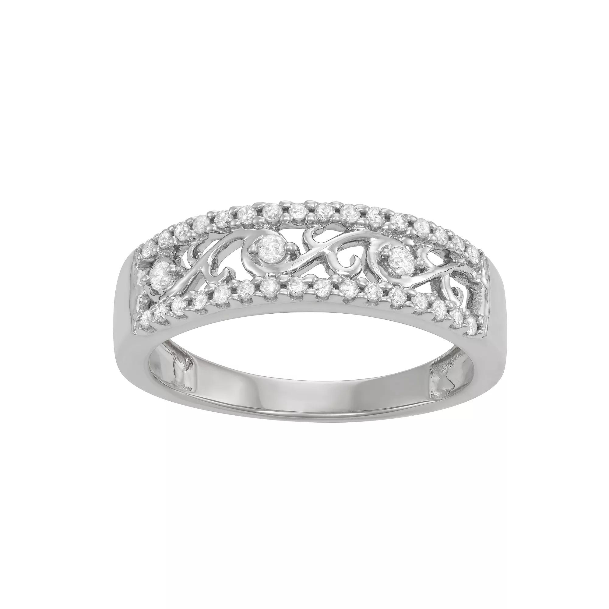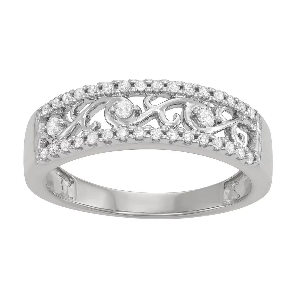 Elegant floral filigree and dazzling round-cut diamonds make this 10k gold ring a breathtaking accent to your look. Elegant floral filigree and dazzling round-cut diamonds make this 10k gold ring a breathtaking accent to your look. Width: 7 mm Metal: 10k gold Finish: polished Packaging: boxedDIAMOND DETAILS Total weight: 1/4 ct. Color grade: H-I Clarity: I1-I2 Shape: round Setting: prong Gemstones may have been treated to enhance their appearance. Special care may be required. Please visit our Gemstone Treatment & Special Care Guide for more information. Diamond weights are approximate. Diamond total weights may vary between .01 and .08 ct. Some diamonds have fewer than 17 facets. Image(s) may be enlarged to show detail. Please note, due to the high value of this item, a signature may be required upon delivery. Size: 6. Color: White. Gender: female. Age Group: adult.