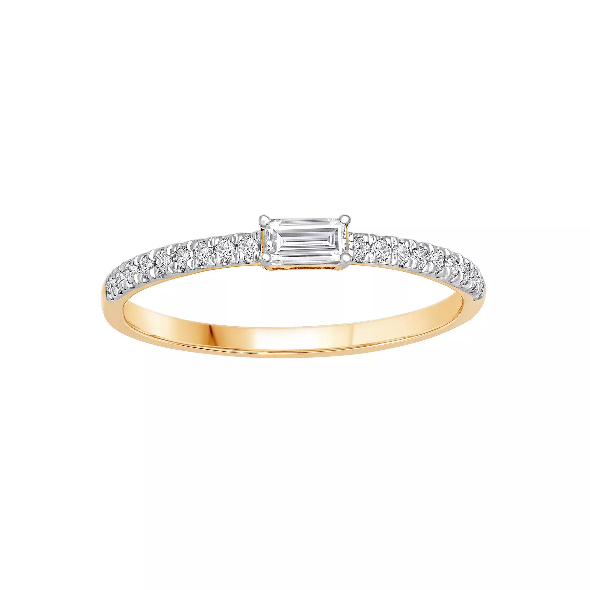 Crafted from 10k gold, and featuring baguette- and round-cut diamonds, this stylish ring is perfect for wearing alone or stacking. Crafted from 10k gold, and featuring baguette- and round-cut diamonds, this stylish ring is perfect for wearing alone or stacking. Metal: 10k gold Packaging: boxed Width: 1.5 mm Finish: polishedDIAMOND DETAILS Total weight: 1/5 ct. Clarity: I2-I3 Shape: baguette, round Setting: prong Gemstones may have been treated to enhance their appearance. Special care may be required. Please visit our Gemstone Treatment & Special Care Guide for more information. Image(s) may be enlarged to show detail. Please note, due to the high value of this item, a signature may be required upon delivery. Size: 7. Color: Yellow. Gender: female. Age Group: adult.