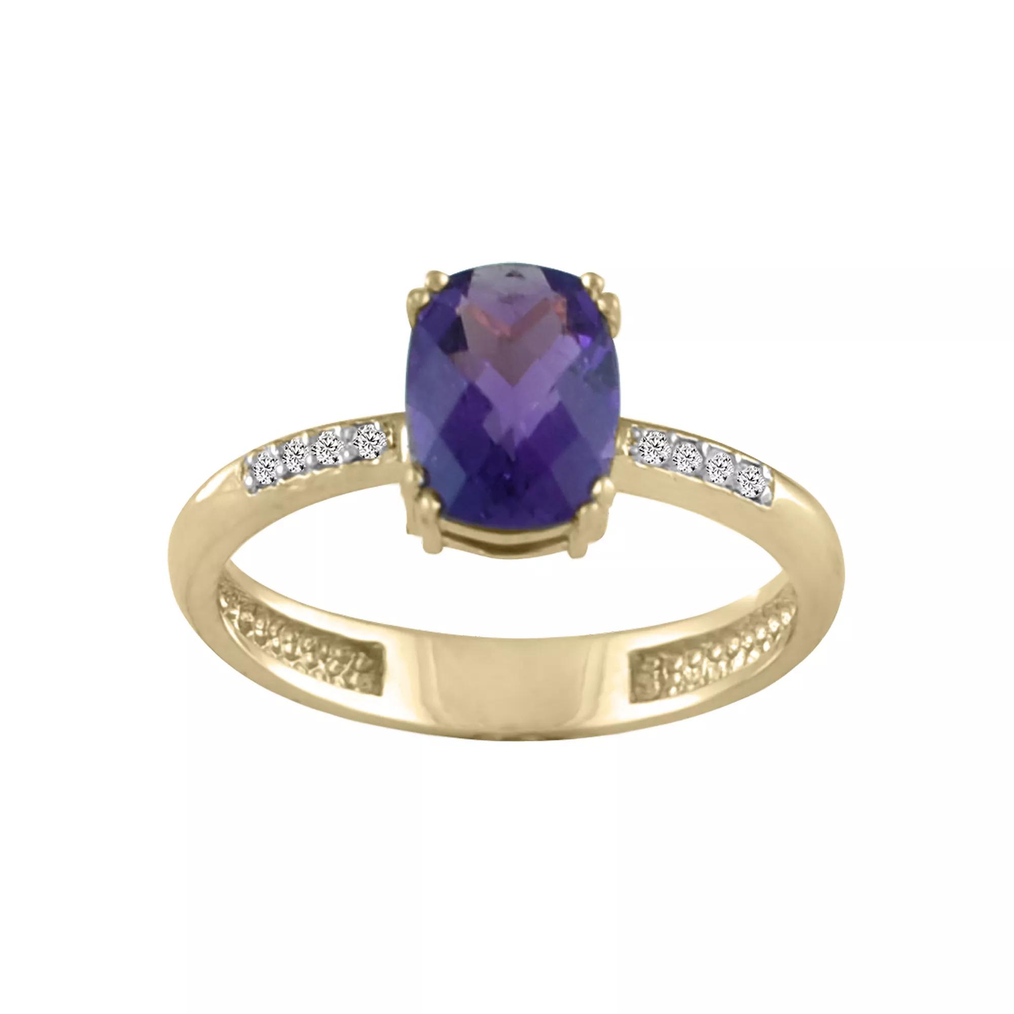 Finish your look with this shimmering 10k Gold Amethyst & Diamond Accent Ring. Click on this JEWELRY & WATCHES GUIDE to learn about fit, styles, materials and more! Finish your look with this shimmering 10k Gold Amethyst & Diamond Accent Ring. Click on this JEWELRY & WATCHES GUIDE to learn about fit, styles, materials and more! FEATURES Width: 3.0 mm Shank style: straight Band fit: rounded Metal: 10k gold Plating: 10k gold Finish: polished Packaging: boxed ImportedSTONE DETAILS Stone type: amethyst Total weight: 1 3/4 ct. Center stone weight: 1 3/4 ct. Center stone size: 8 mm x 6 mm Shape: cushion cut Setting: prongDIAMOND DETAILS Total weight: less than 1/10 ct. Color grade: H Clarity: I2 Shape: round Setting: micro prong Diamond weights are approximate. Diamond Total Weights may vary between .01 and .13 ct. Some diamonds consist of fewer than 17 facets. Gemstones may have been treated to enhance their appearance. Special care may be required. Please visit our Gemstone Treatment & Special Care Guide for more information. Image(s) may be enlarged to show detail. Size: 7. Gender: female. Age Group: adult.