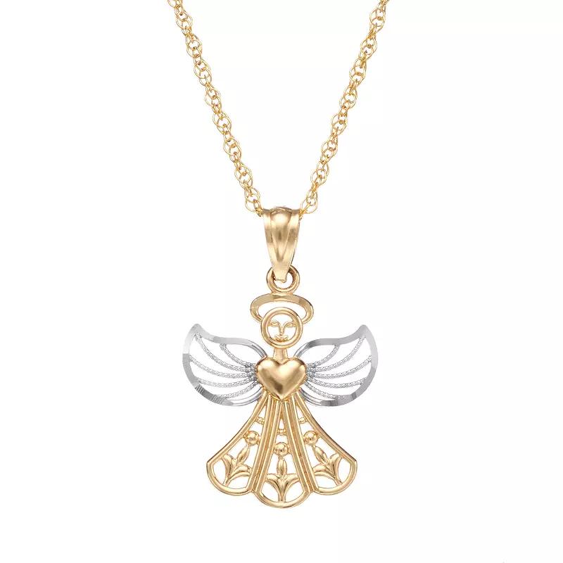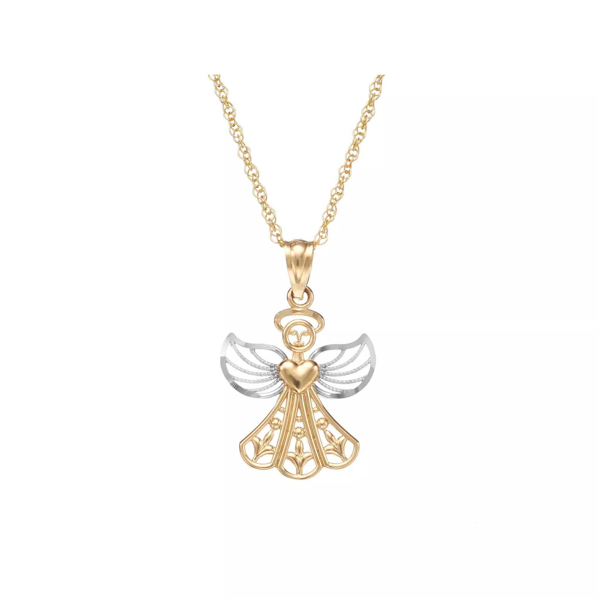 Sent from above. Decorated with an open-worked angel pendant, this 10k gold necklace graces you with divine design. Comes in a gift box.PENDANT DETAILSPendant length: .86 in.Chain length: 18 in.Clasp: spring-ringMetal: 10k gold, white rhodium-plated 10k goldChain Details: 14k gold-filled cable chain Size: 18". Gender: female. Age Group: adult.