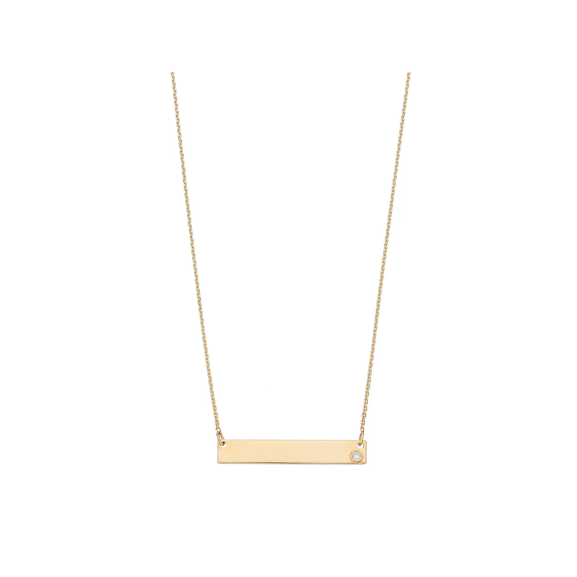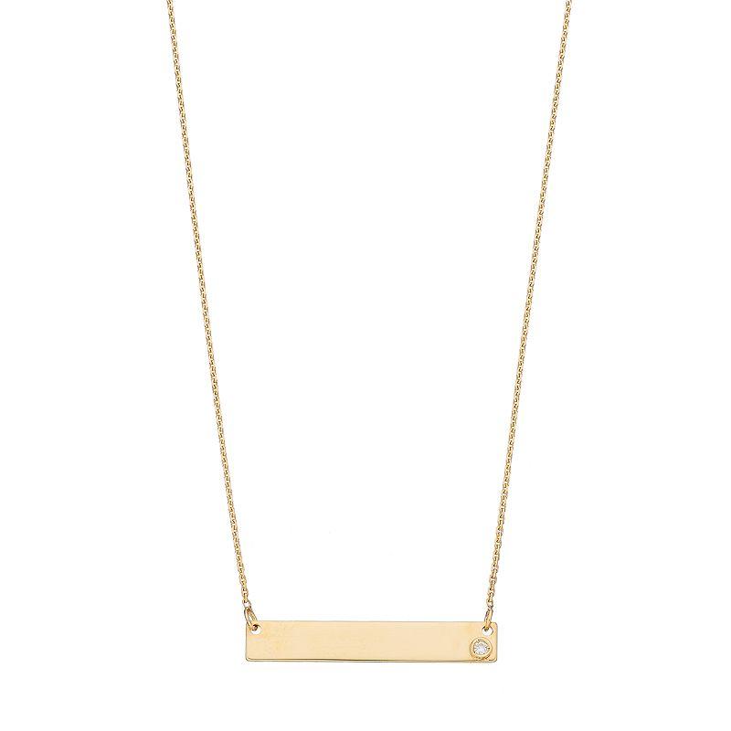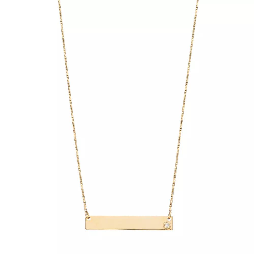 Accentuated with a bezel-set diamond, this 10k gold bar link necklace is stunning. NECKLACE DETAILS Pendant size: 0.13"L x 0.88"W Chain length: 16 in. with 2-in. extender Clasp: lobster-claw Metal: 10k gold Finish: polished Packaging: boxed DIAMOND DETAILS Total weight: less than 1/10 ct. Shape: round Color grade: H-I Clarity: I3 Setting: bezel Gemstones may have been treated to enhance their appearance. Special care may be required. Please visit our Gemstone Treatment & Special Care Guide for more information.Image(s) may be enlarged to show detail.Diamond weights are approximate. Diamond total weights may vary between .01 and .08 ct. Some diamonds have fewer than 17 facets. Size: 16". Color: Yellow. Gender: female. Age Group: adult.