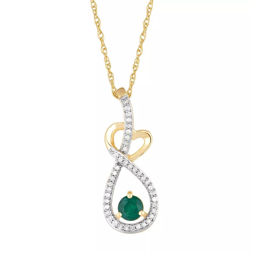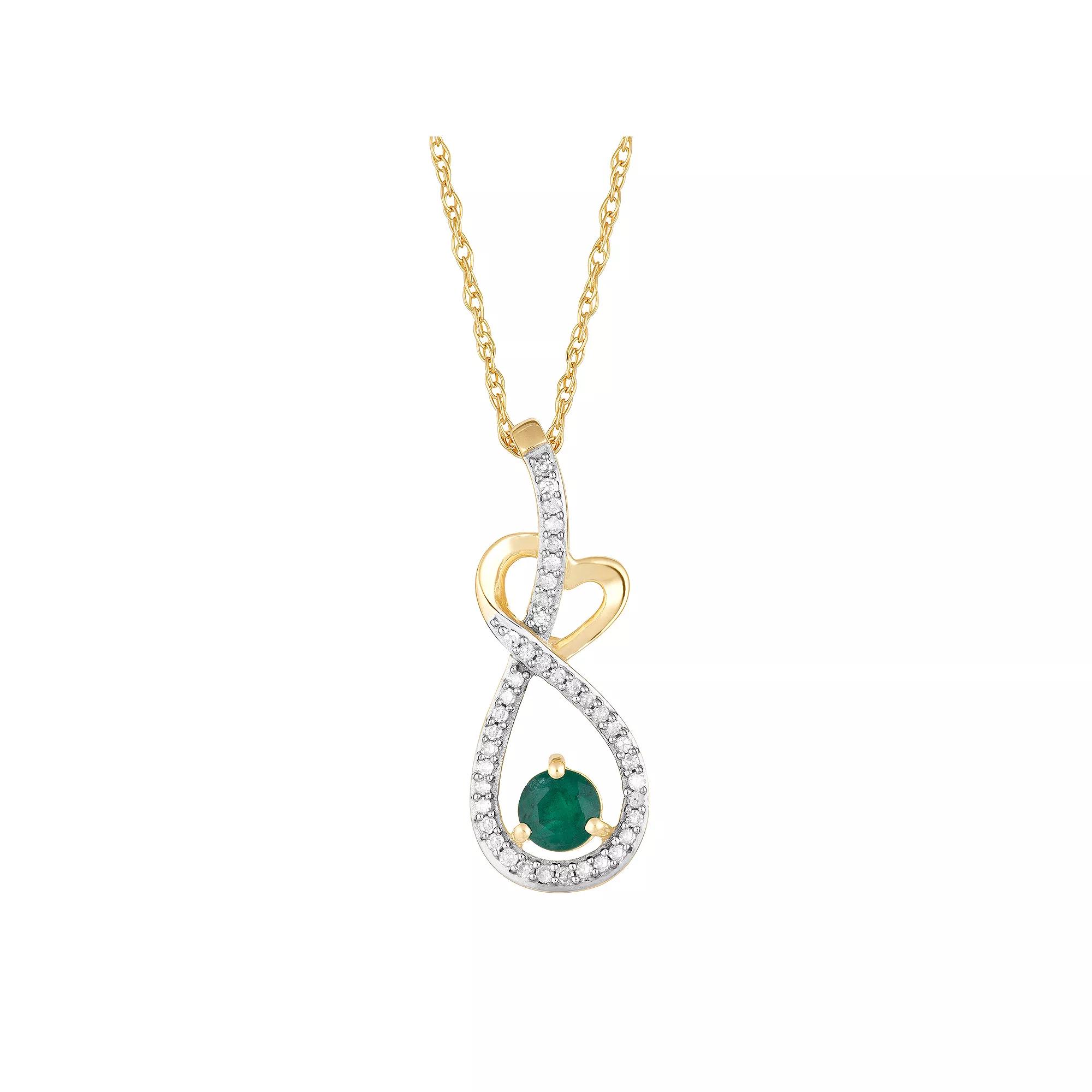 Crafted from 10k gold and accented with rhodium, this elegant emerald and diamond pendant necklace completes your look in a captivating way. PENDANT DETAILS Pendant size: 0.88 in. x 0.33 in. Chain length: 18 in. Chain type: rope Clasp: spring ring Metal: 10k gold Plating: rhodium Finish: polished Packaging: boxed STONE DETAILS Stone type: emerald Total weight: 1/4 ct. Center stone size: 4 mm Shape: round cut Setting: prong DIAMOND DETAILS Total weight: 1/8 ct. Color grade: I-J Clarity: I2-I3 Shape: round Setting: prong Gemstones may have been treated to enhance their appearance. Special care may be required. Please visit our Gemstone Treatment & Special Care Guide for more information.Image(s) may be enlarged to show detail.Diamond weights are approximate. Diamond total weights may vary between .01 and .08 ct. Some diamonds have fewer than 17 facets. Size: 18". Color: Green. Gender: female. Age Group: adult.
